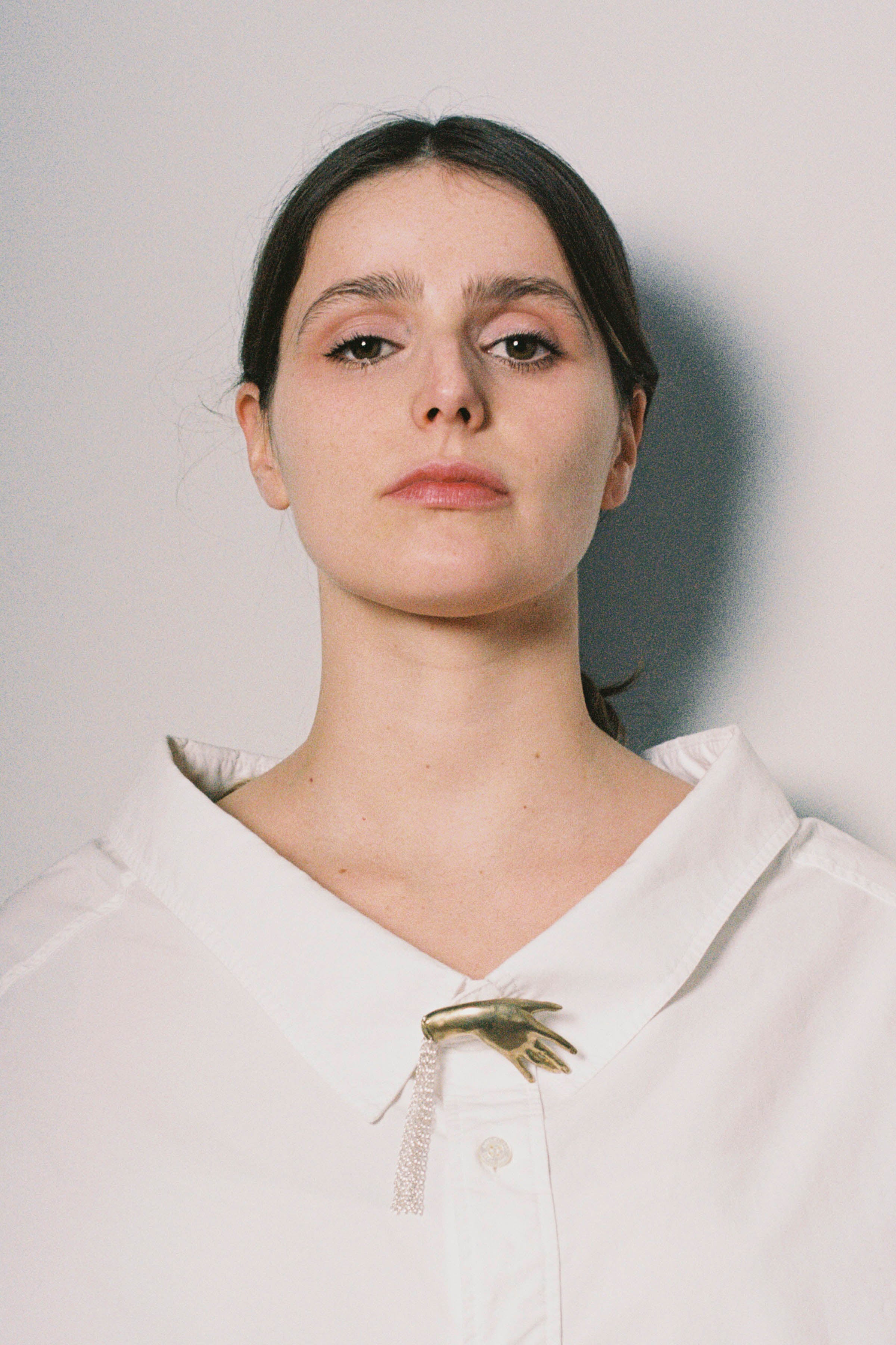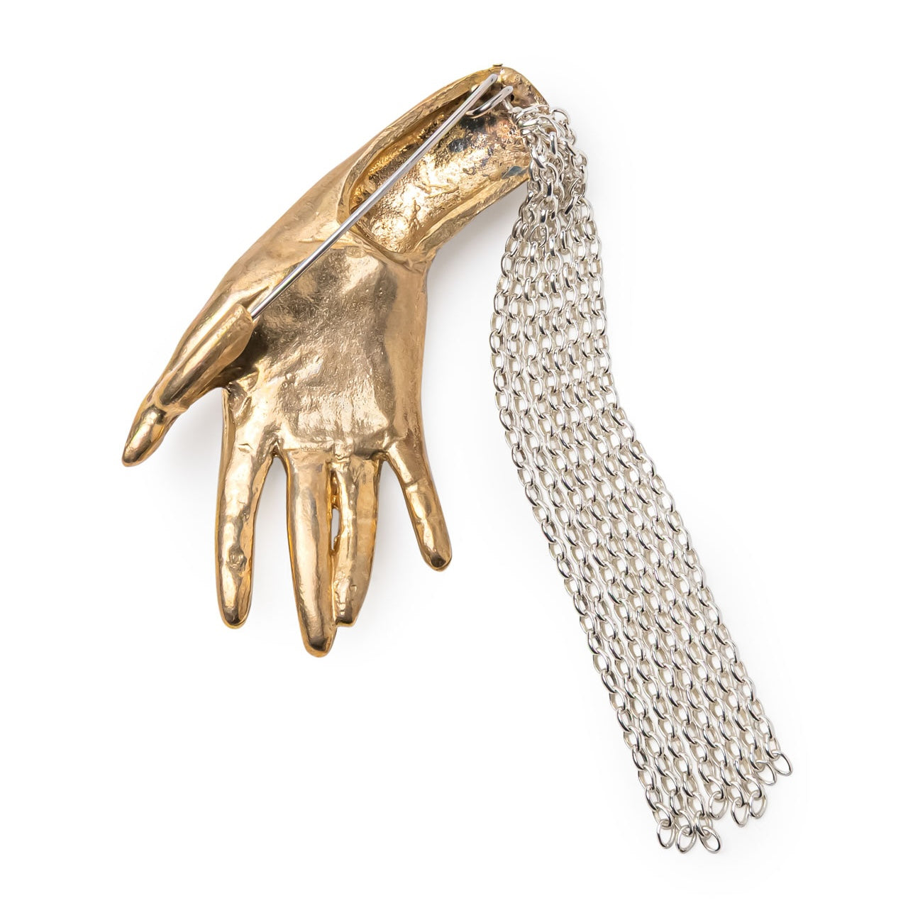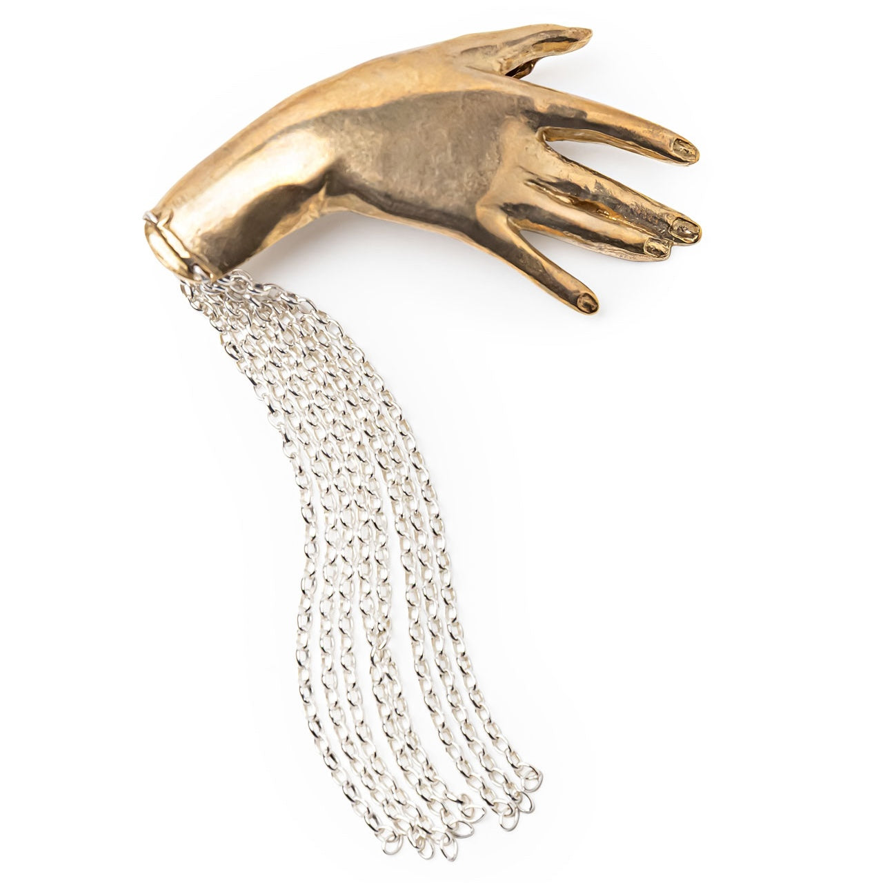 Hand brooch with a dangling silver tassel chain.