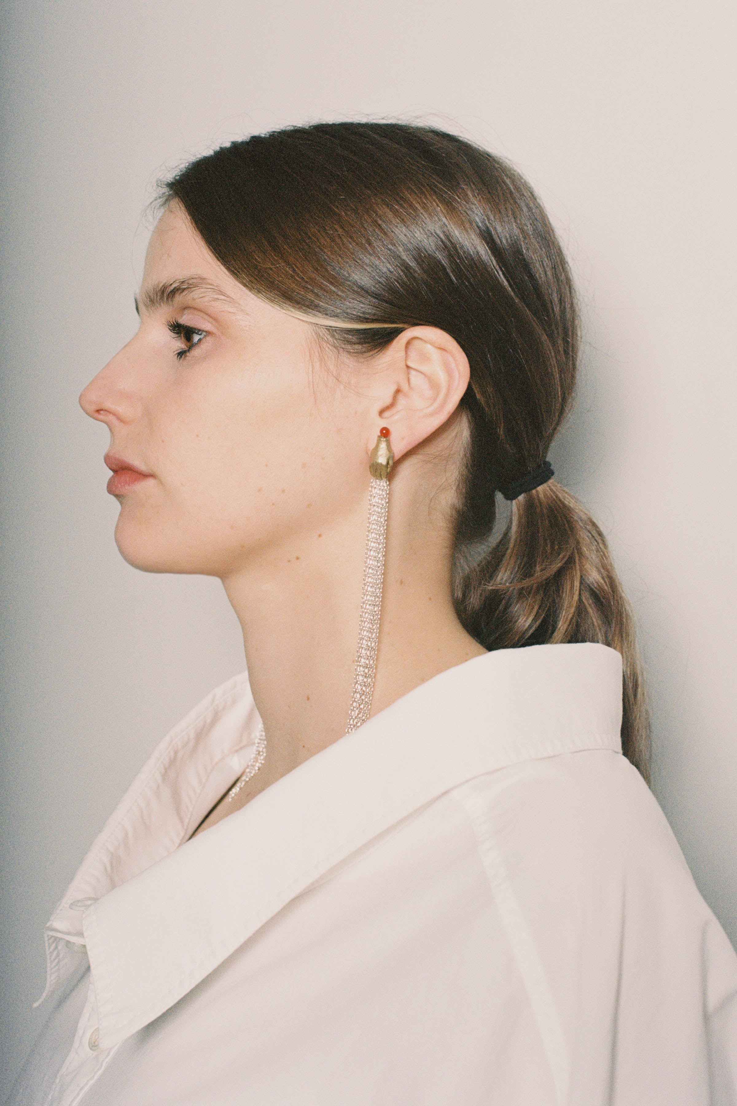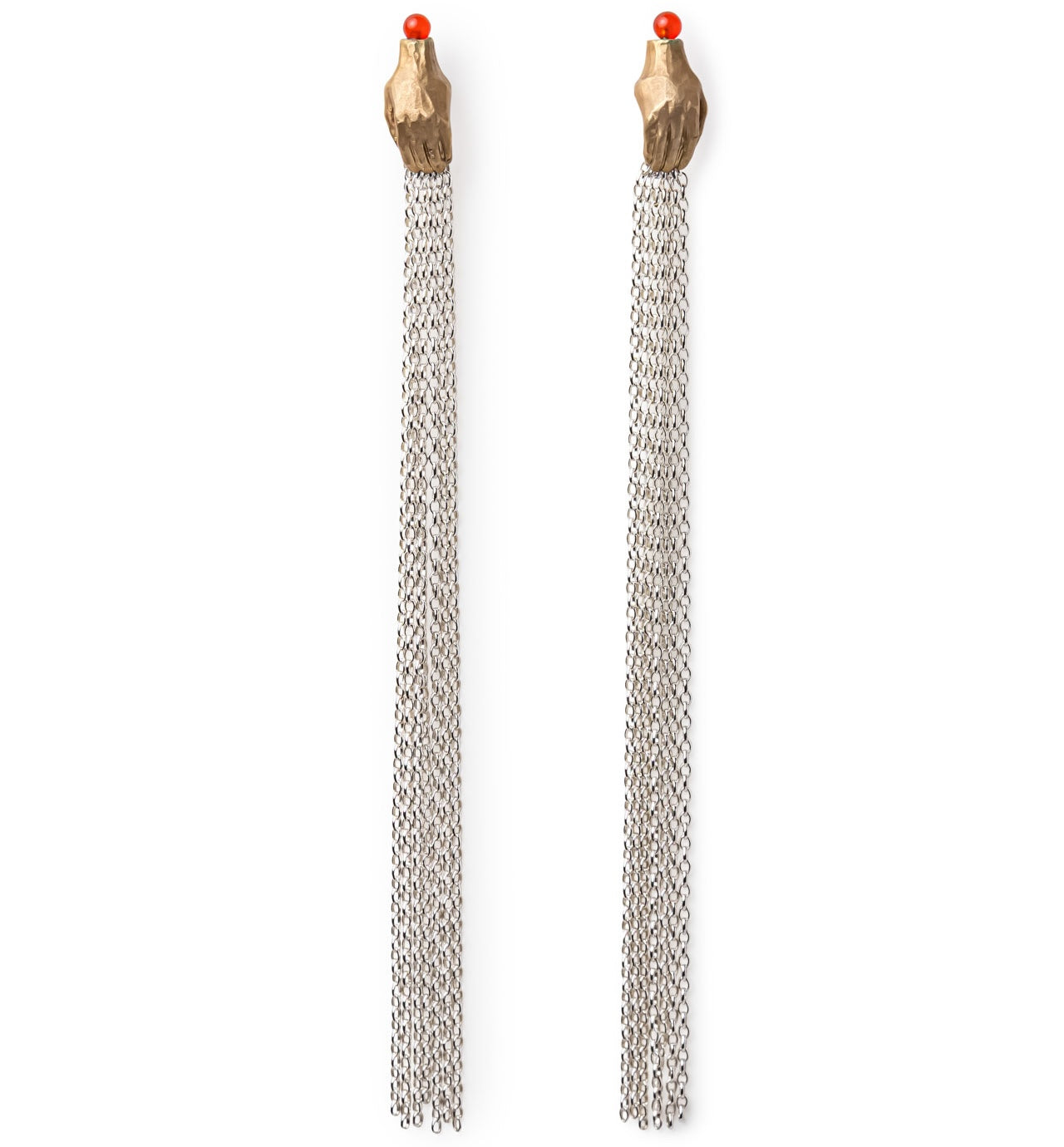 Hand earrings with chain tassels and red agate bead.