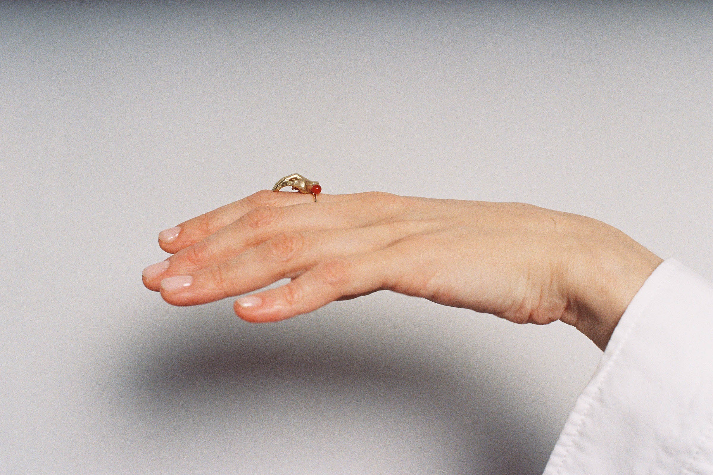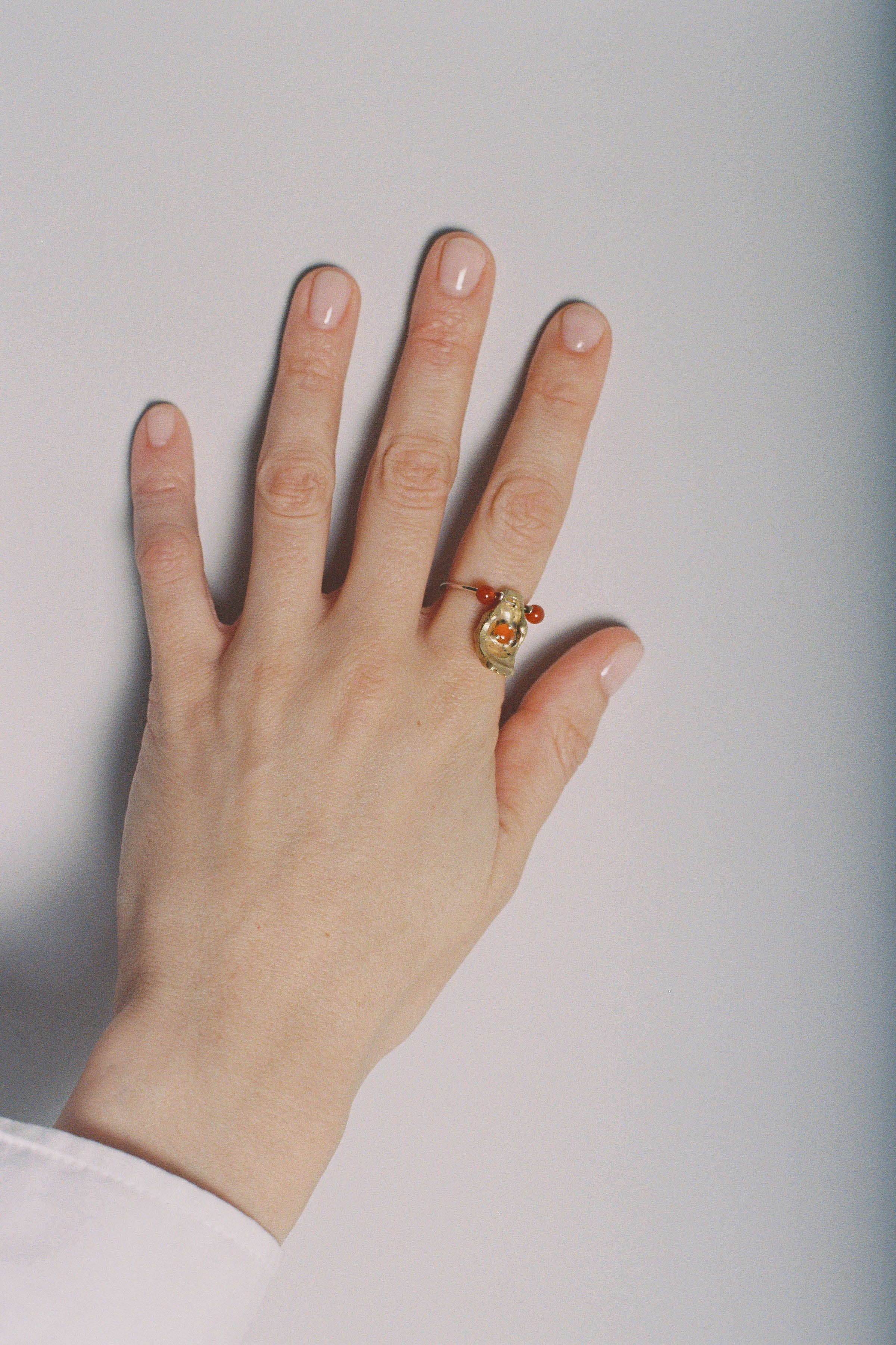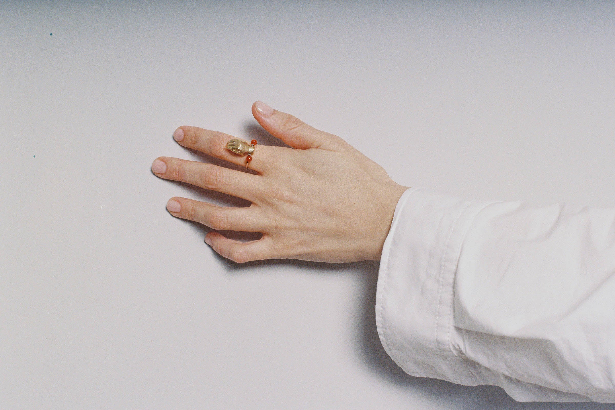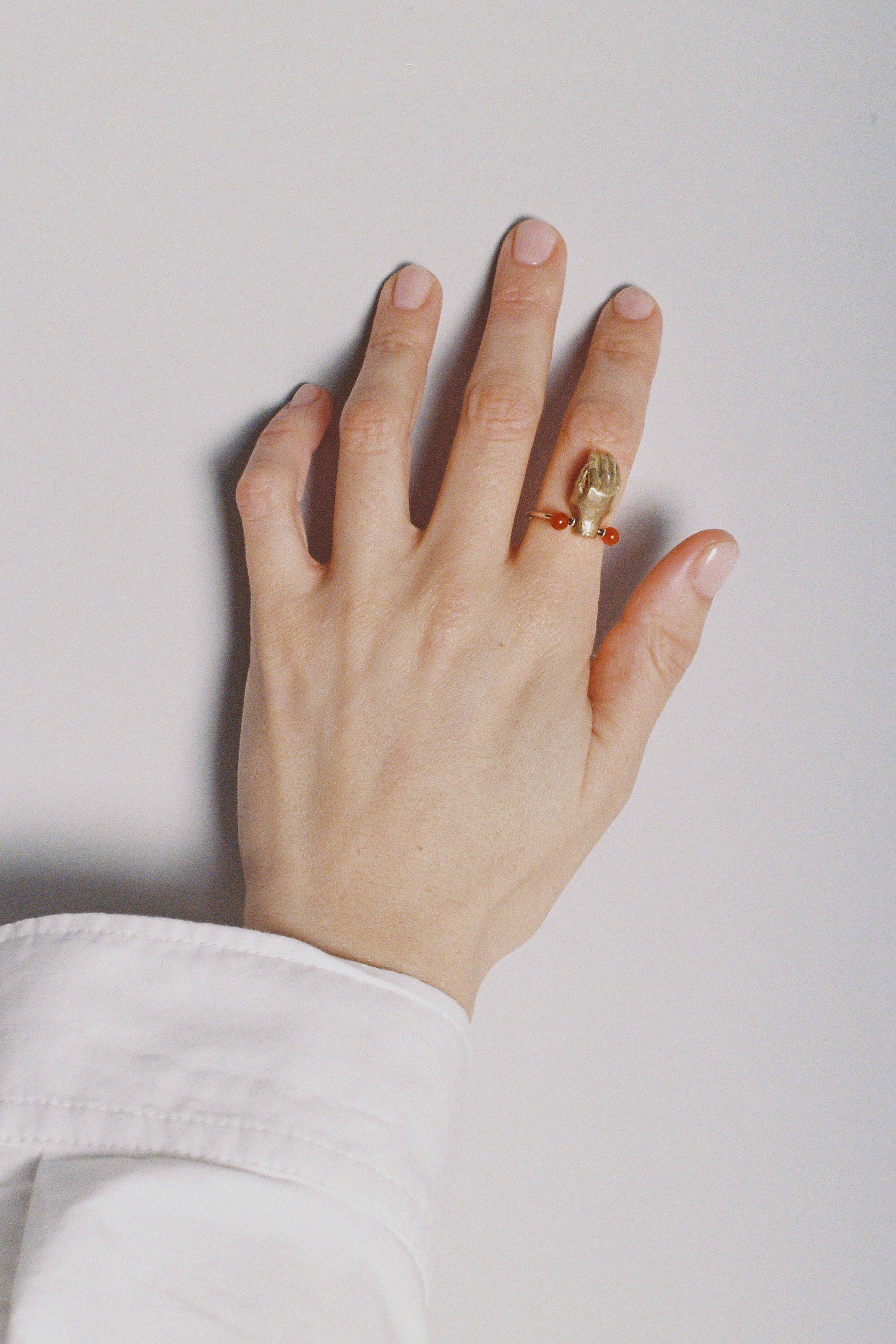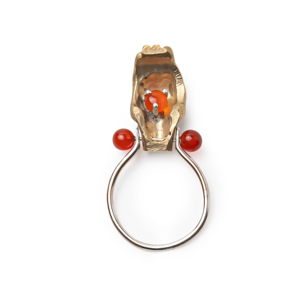 Silver band set with Red Agates and topped with a movable brass hand holding a Carnelian..