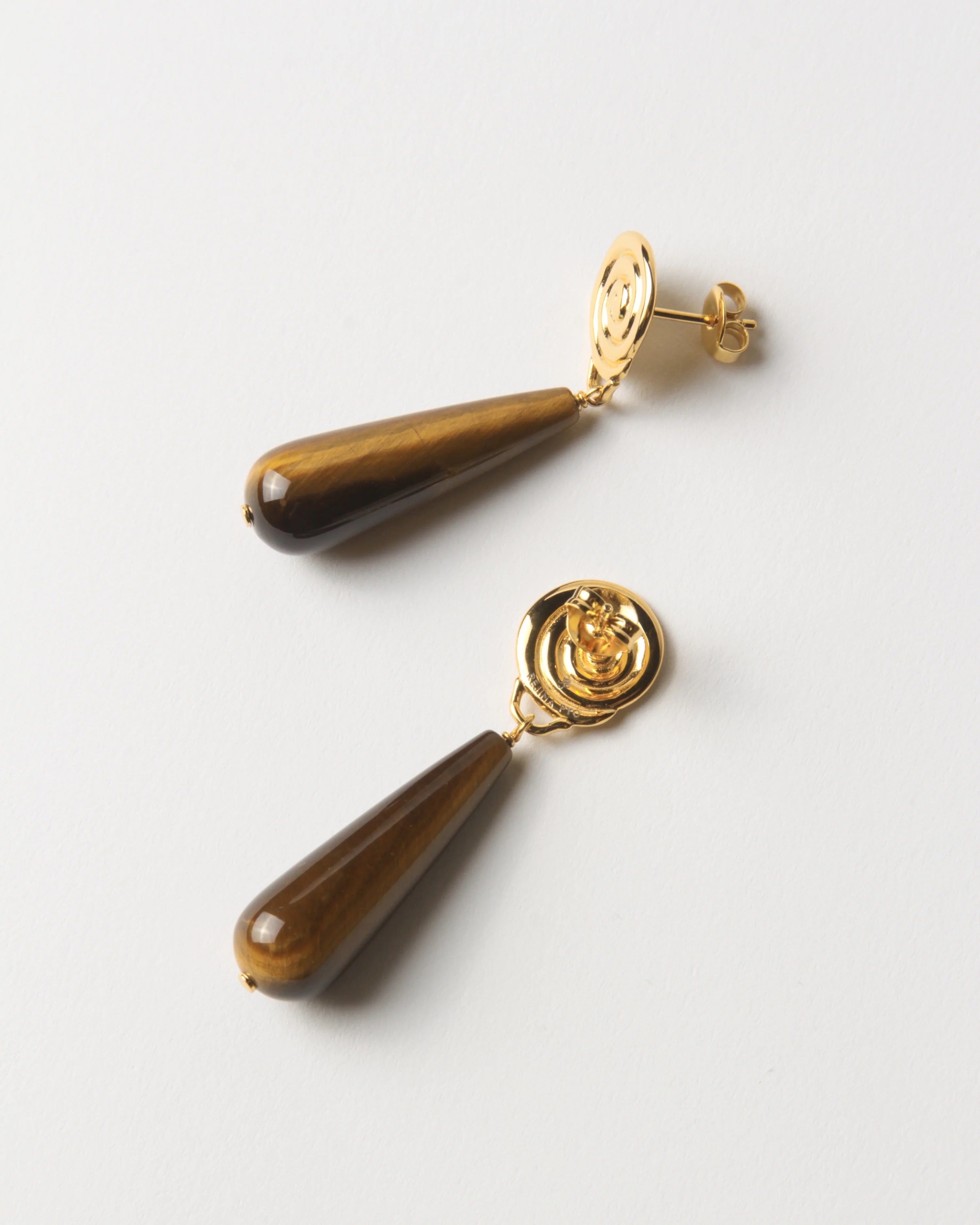 The Swirl Tear Droplet earrings showcase gold-plated swirl posts combined with tapered Tiger's Eye drops, creating a timeless and elegant design that is both flattering and lightweight.
