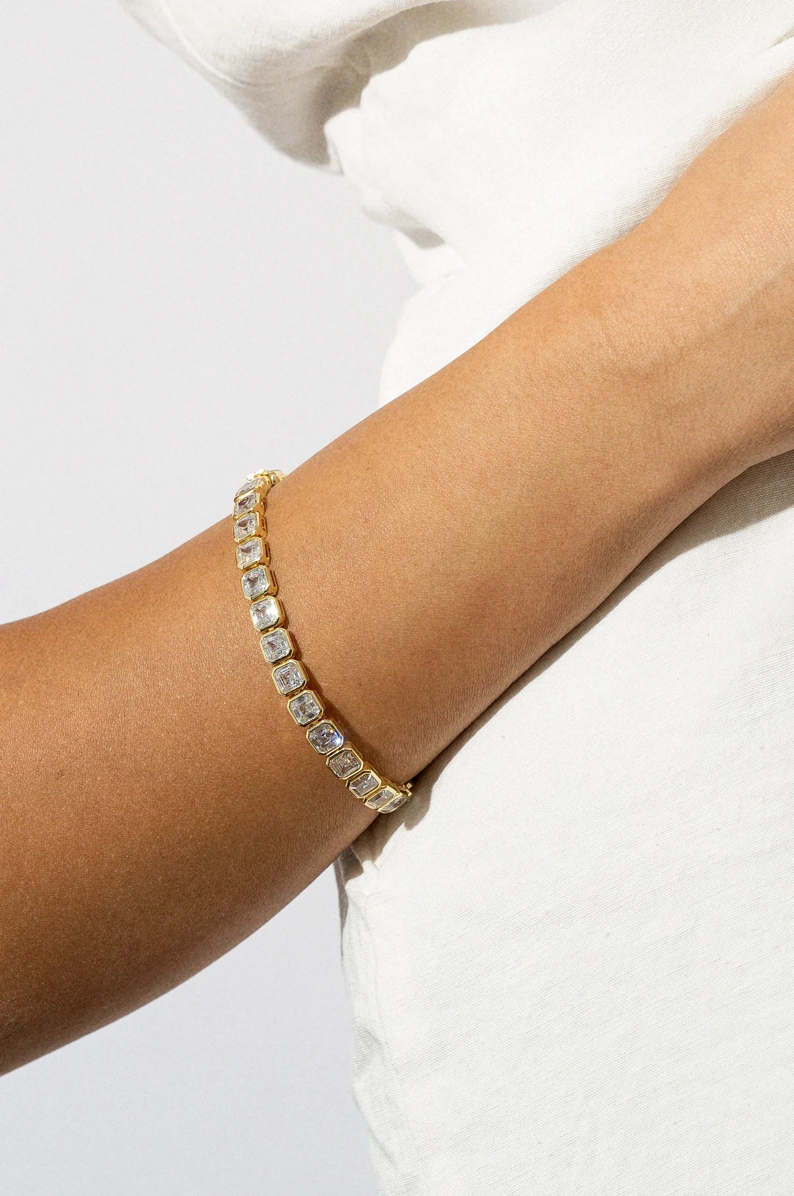 The Elysian Bracelet offers a timeless elegance with a modern touch. Crafted from 18k gold-plated brass, it features a series of radiant square-cut cubic zirconias that catch the light beautifully. Perfect for elevating both everyday looks and special occasions, this classic-with-a-twist piece is your ultimate go-to for effortless sophistication.