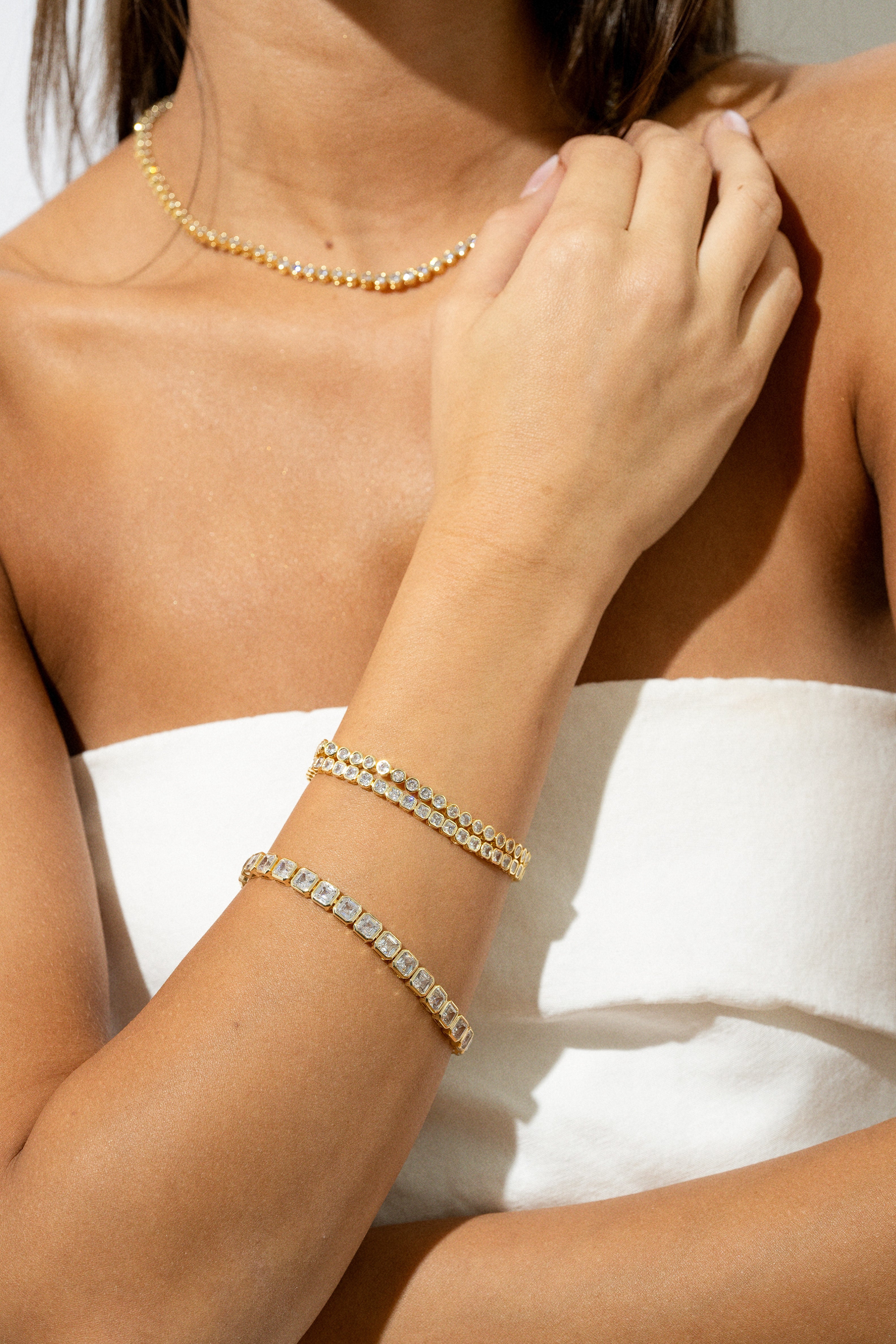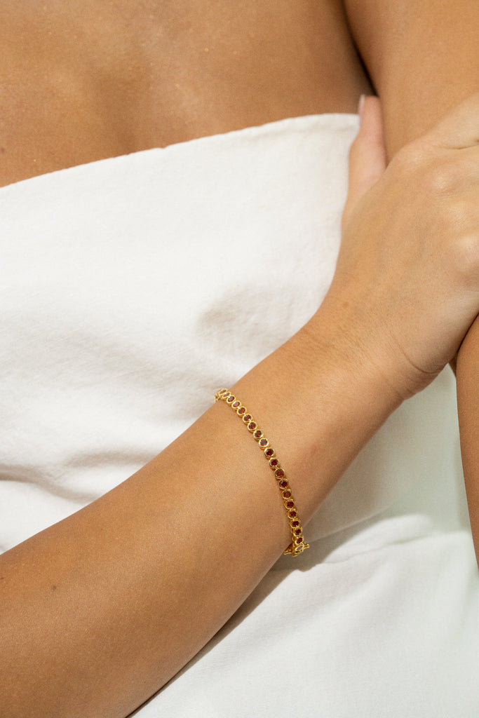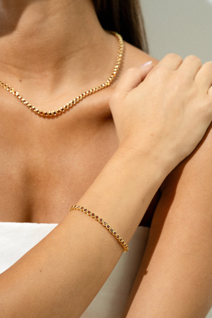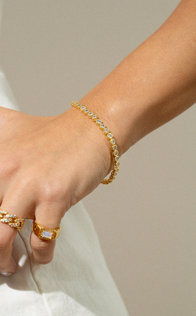 Elevate your everyday look with this timeless 18k gold-plated bracelet in the beautiful color Amber. Featuring round cubic zirconia stones set in brass, this classic design is perfect for stacking or wearing solo, adding a touch of elegance to any outfit.
