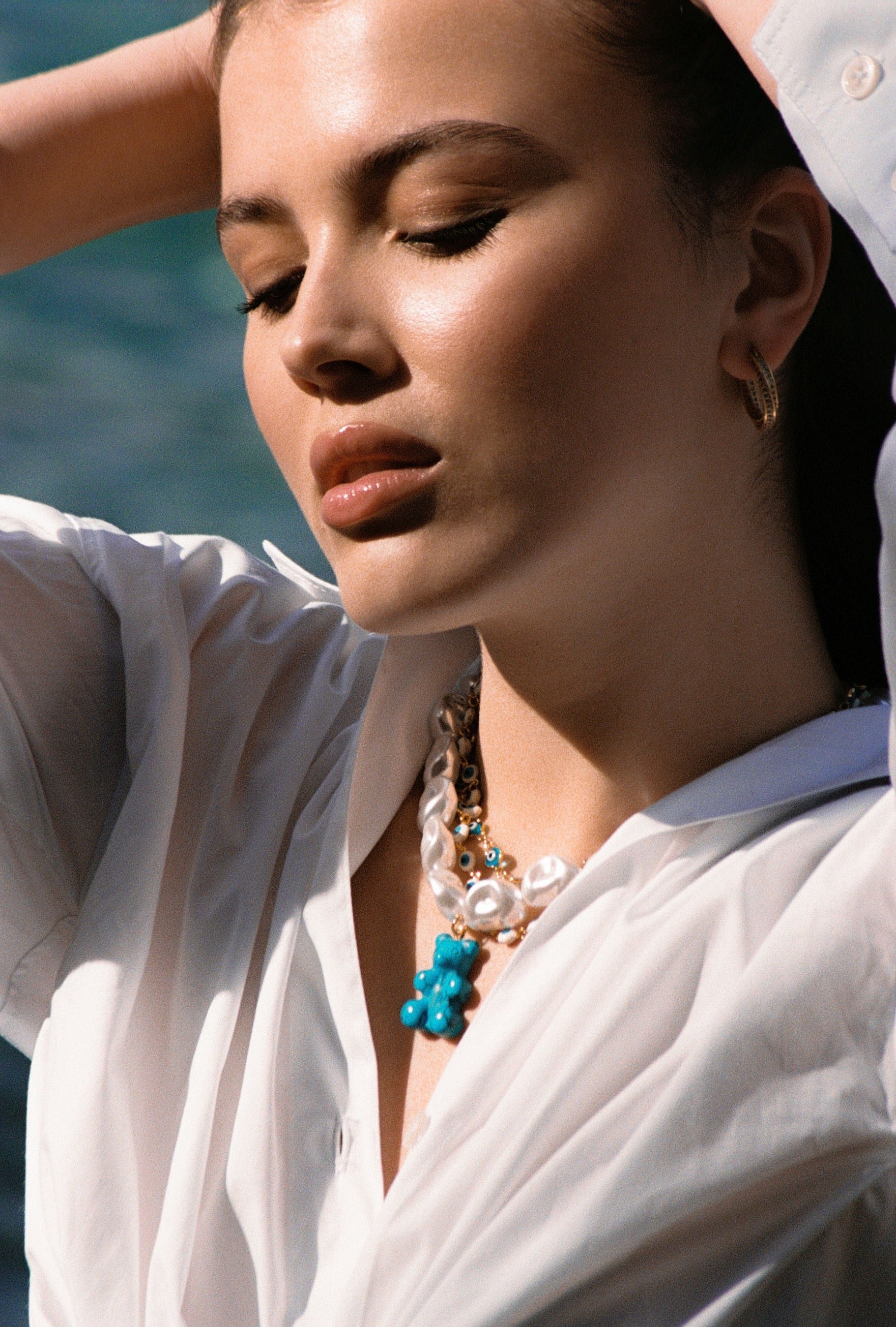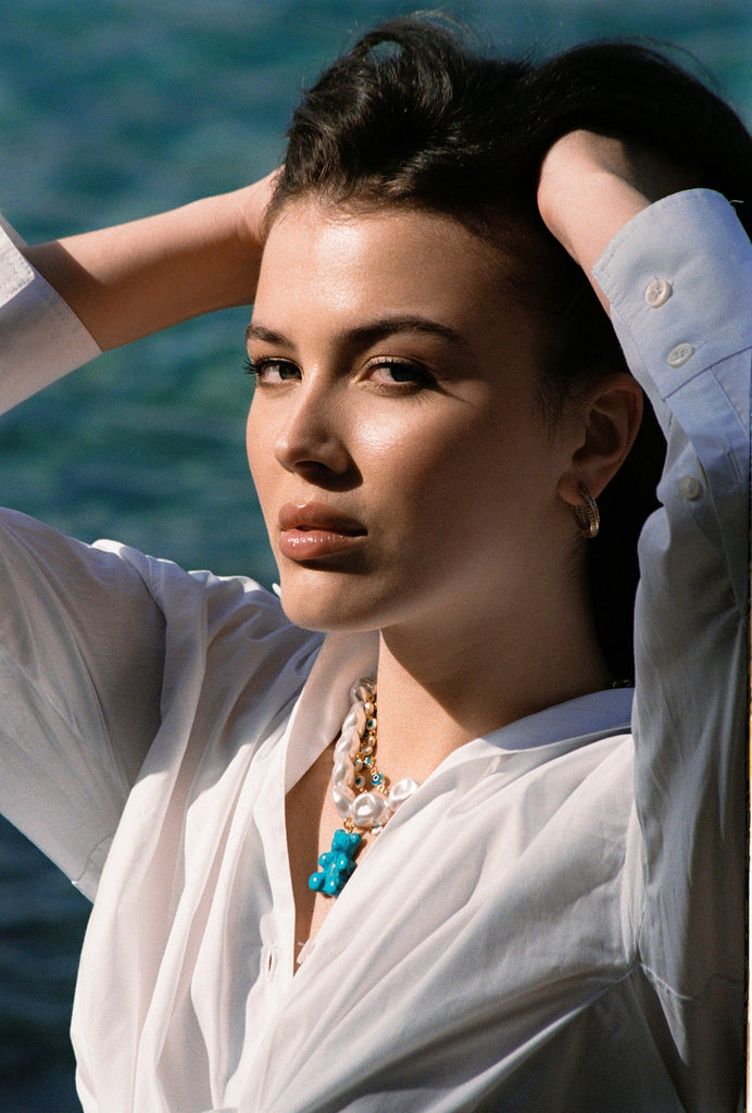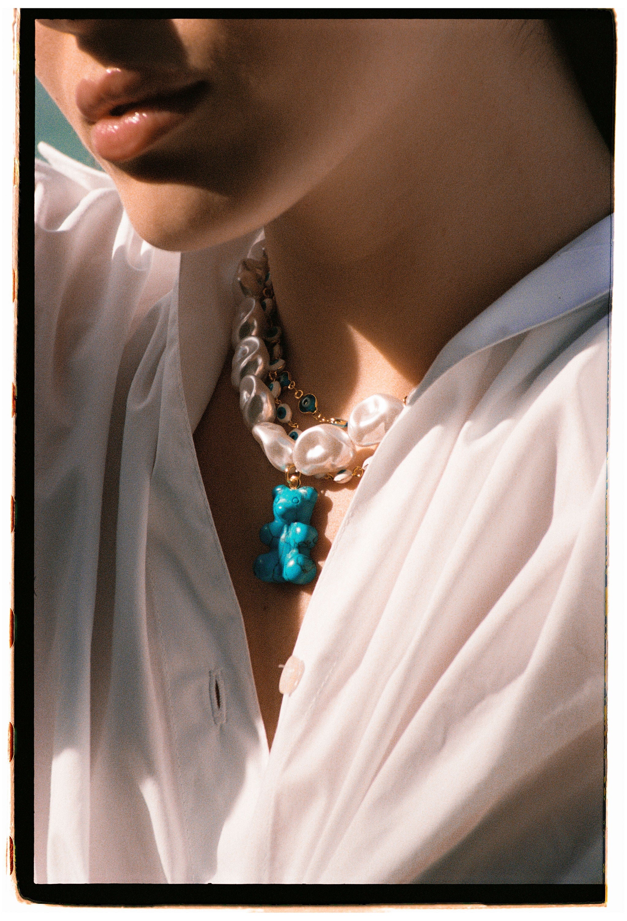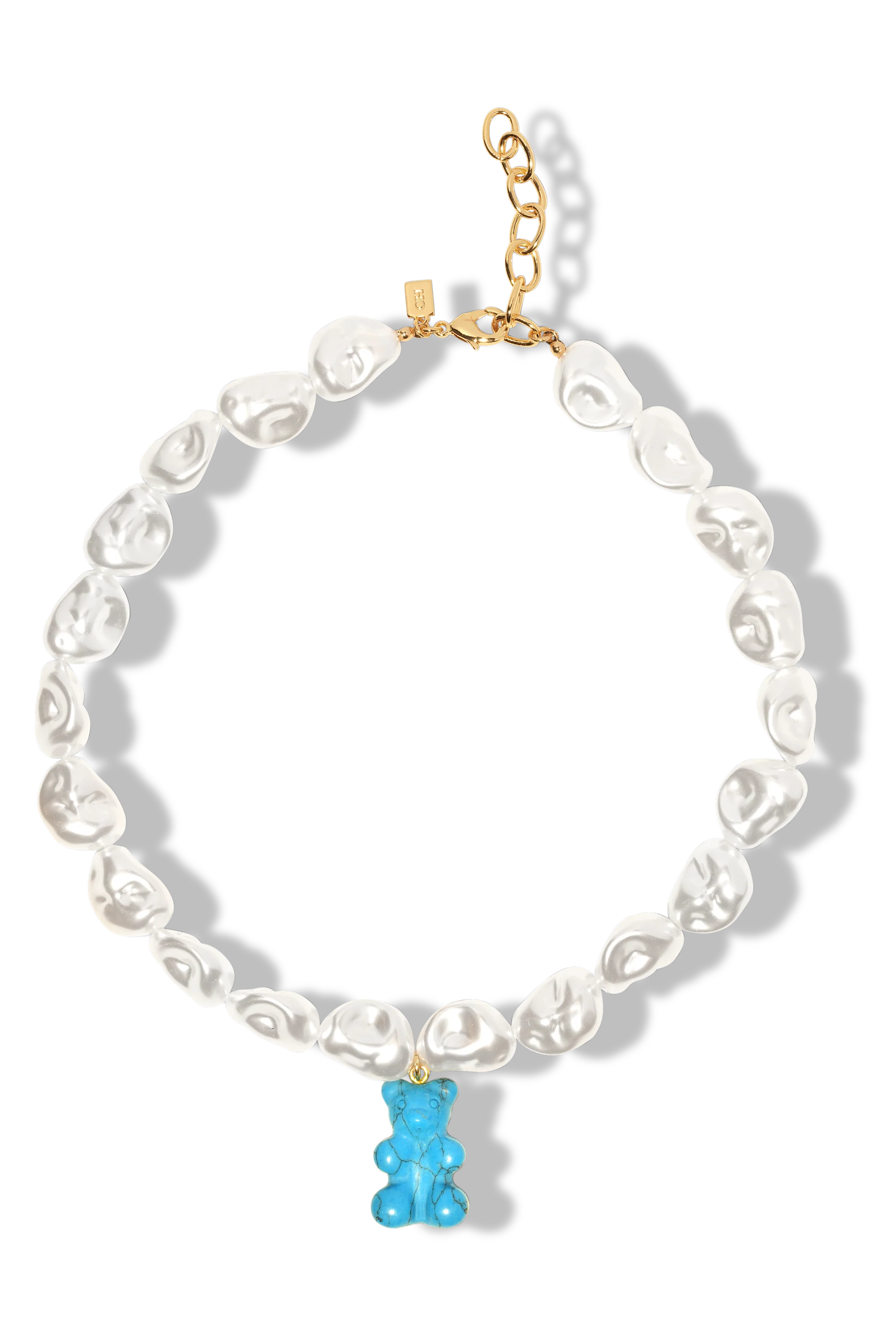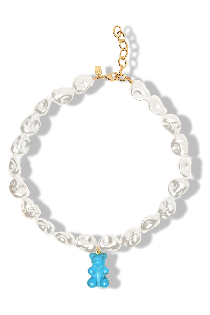 Inspired by unique and distinctive Keshi pearls, our Turquoise Mega Nostalgia Bear Necklace is the perfect accessory for your summer holidays. The organic shapes of the artificial pearl-like beads are reminiscent of the sea which marries perfectly with the turquoise hues of the blue bear, so make a statement while you’re lying in the sand. This can be purchased with or without the Nostalgia Bear, for a more classic, understated look and the Nostalgia Bear can also be purchased separately to add to your charms collection.