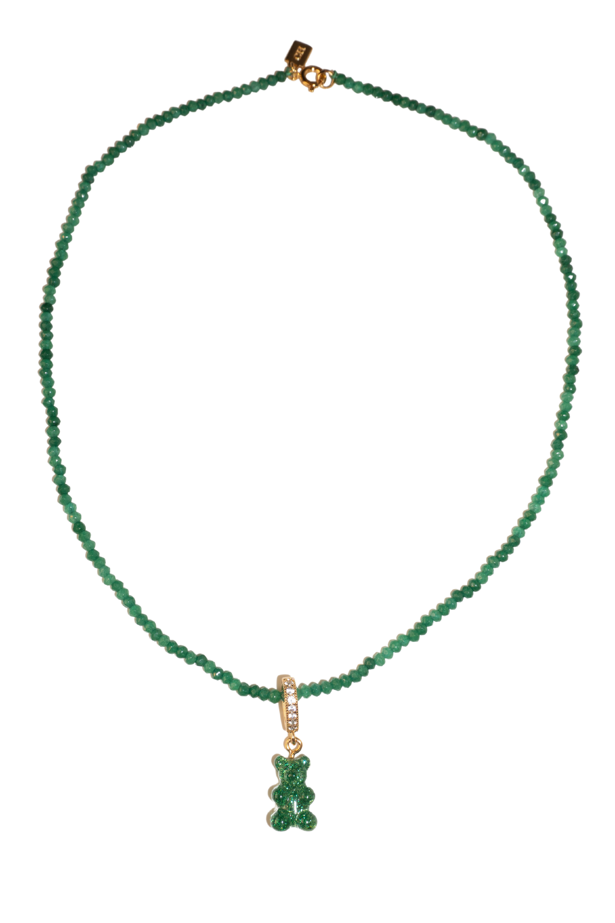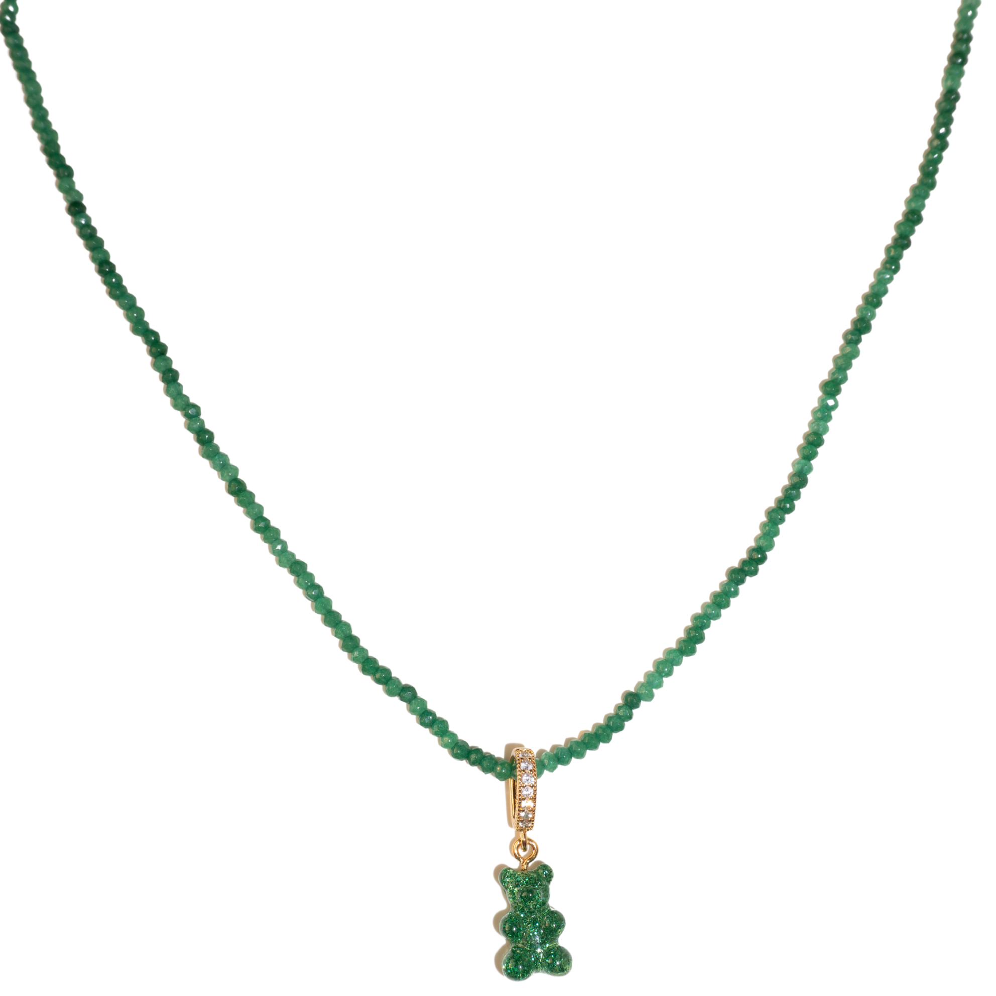 Shiny bead necklace featuring an emerald green glittery transparent Nostalgia Bear.