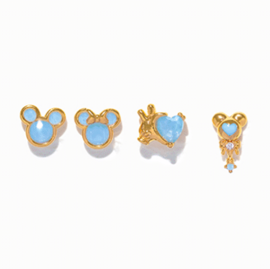 Immerse yourself in the enchanting world of Disney with this adorably dainty four-piece earring set. This set features timeless silhouettes of Mickey Mouse and Minnie Mouse, Mickey's iconic glove embracing a heart, and a captivating Mickey Mouse wand, all elegantly showcased in beautiful shades of blue. This stud set is an absolute must-have for every Disney enthusiast, infusing your everyday style with a touch of magic and whimsy. Experience the magic of Disney with this stud set, designed to capture your heart.