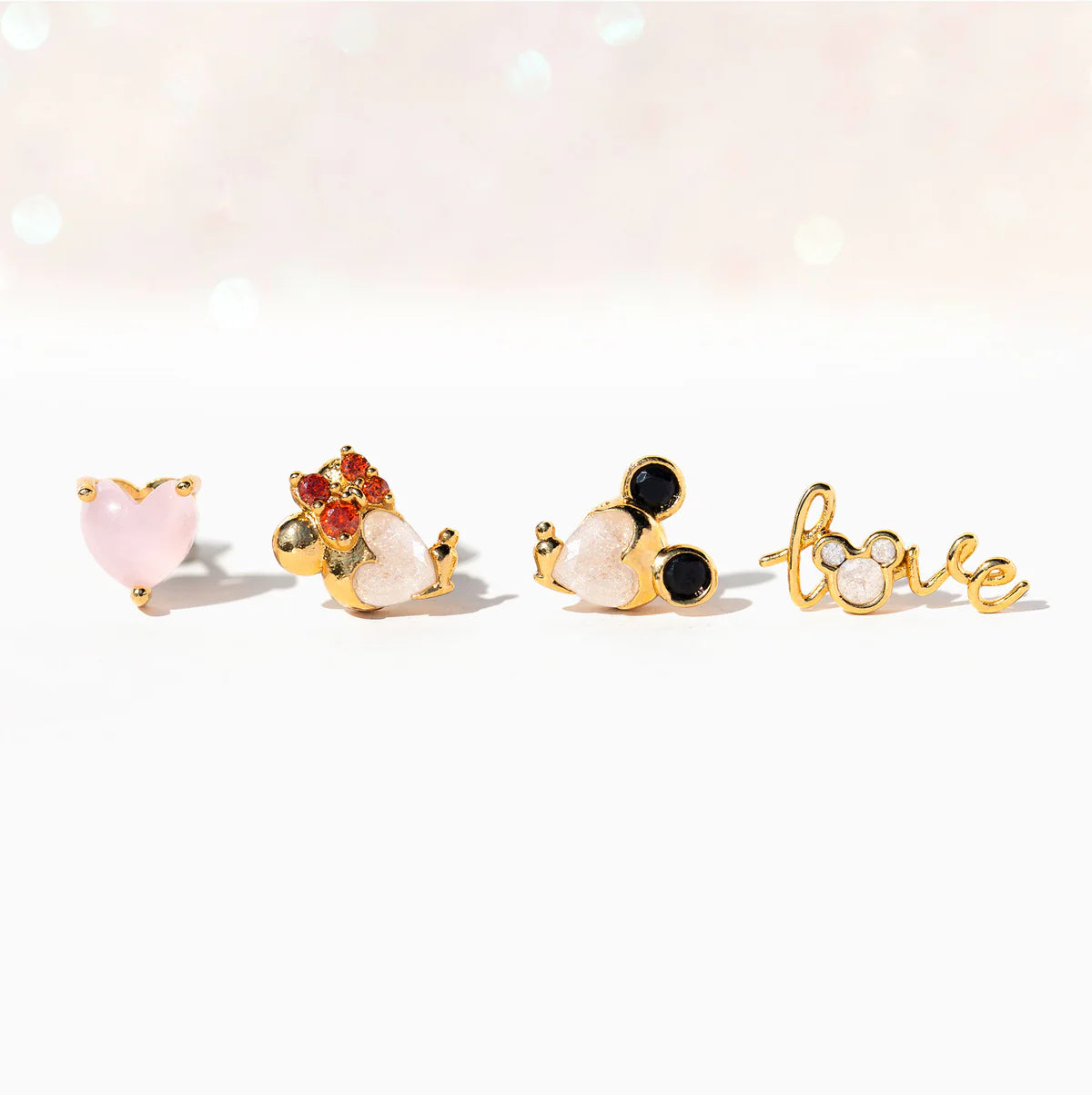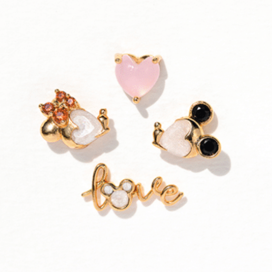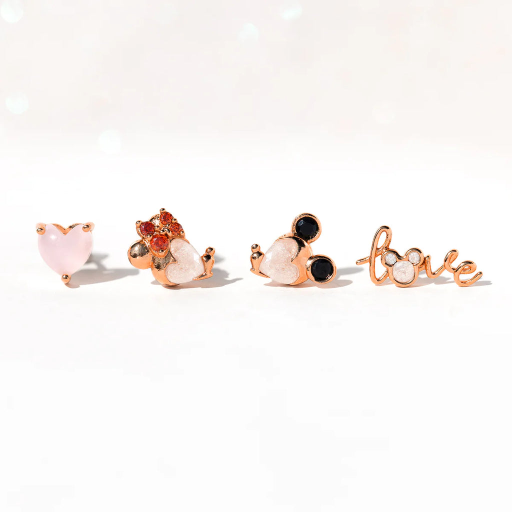 Experience the power of love with our Disney Forever Love Earring Set! Featuring an enchanting stone embedded Mickey Mouse and Minnie Mouse, an elegant cursive "Love" wire stud with a Mickey Mouse silhouette for the 'O,' and a delicate pink heart, this collection perfectly captures the essence of whimsy and romance. Embrace the enchantment and add a touch of classic Disney to your style with this set.