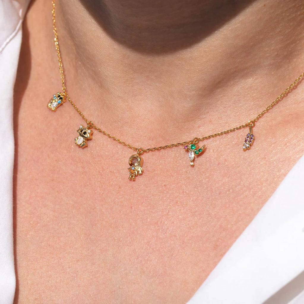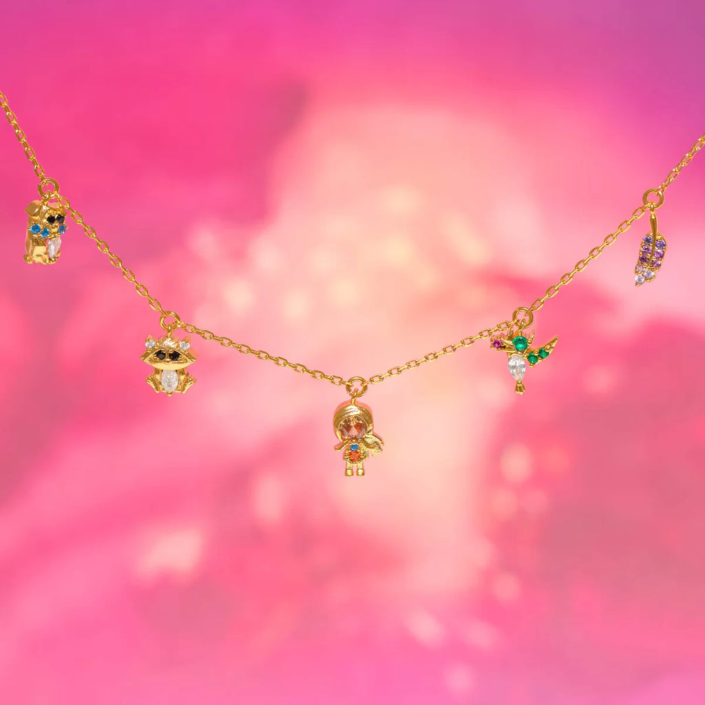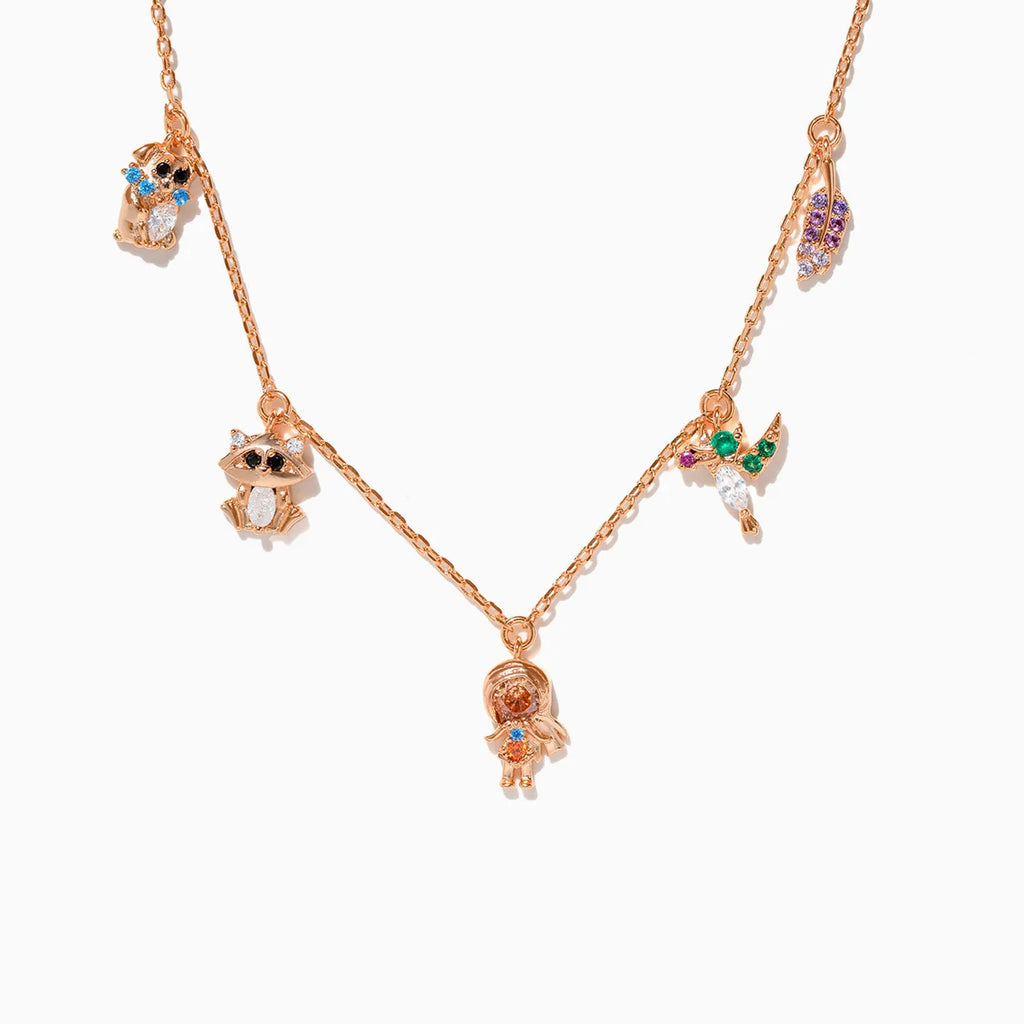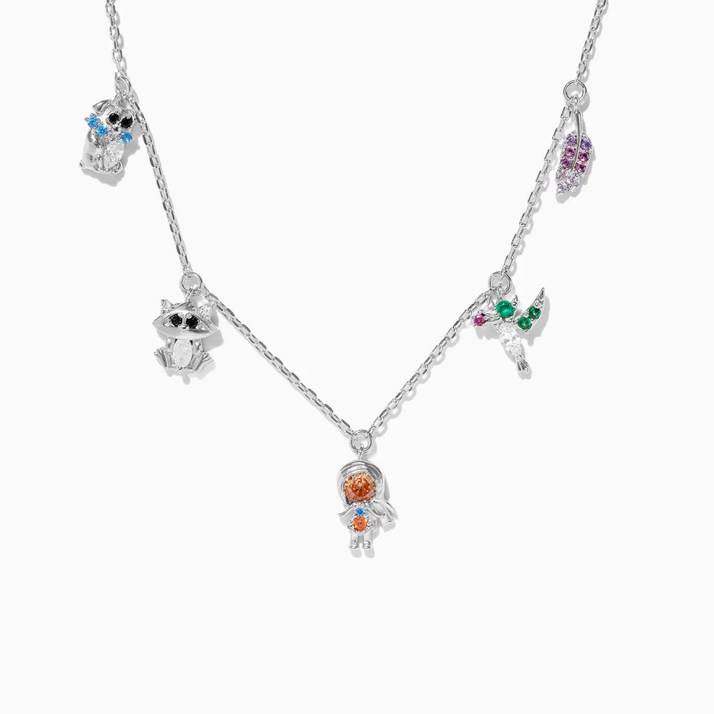 Your next favorite necklace is just around the riverbend! Our Disney Princess Pocahontas Necklace pays tribute to Pocahontas, the courageous member of the Powhatan tribe, feather charm, and her friends Flit, Meeko, and Percy--all adorned in an array of vivid and lustrous stones.