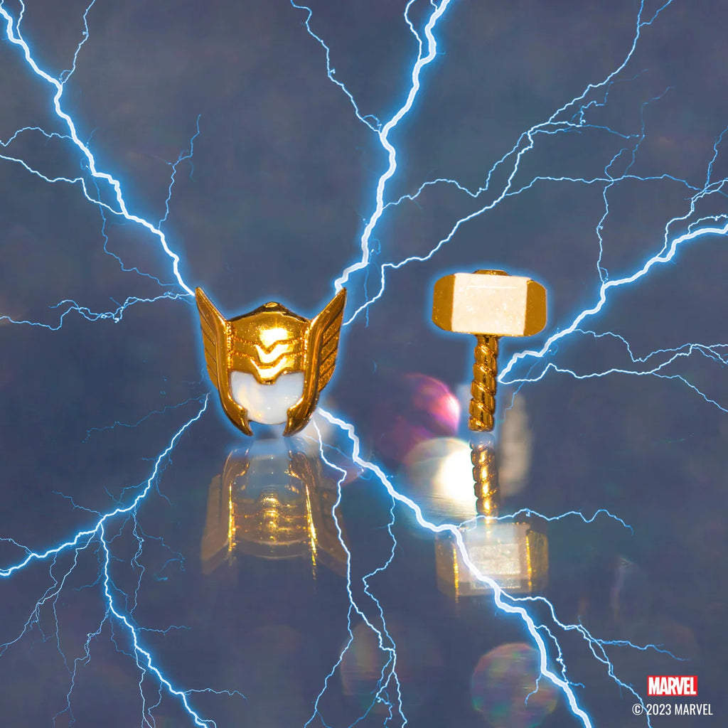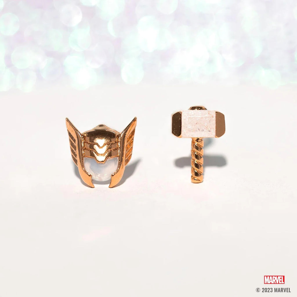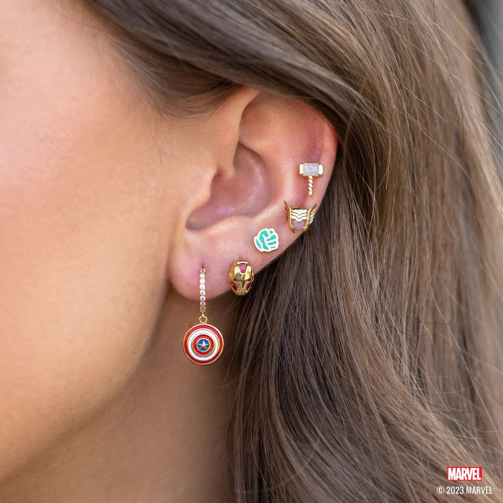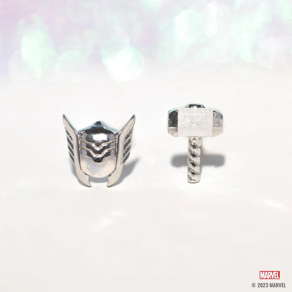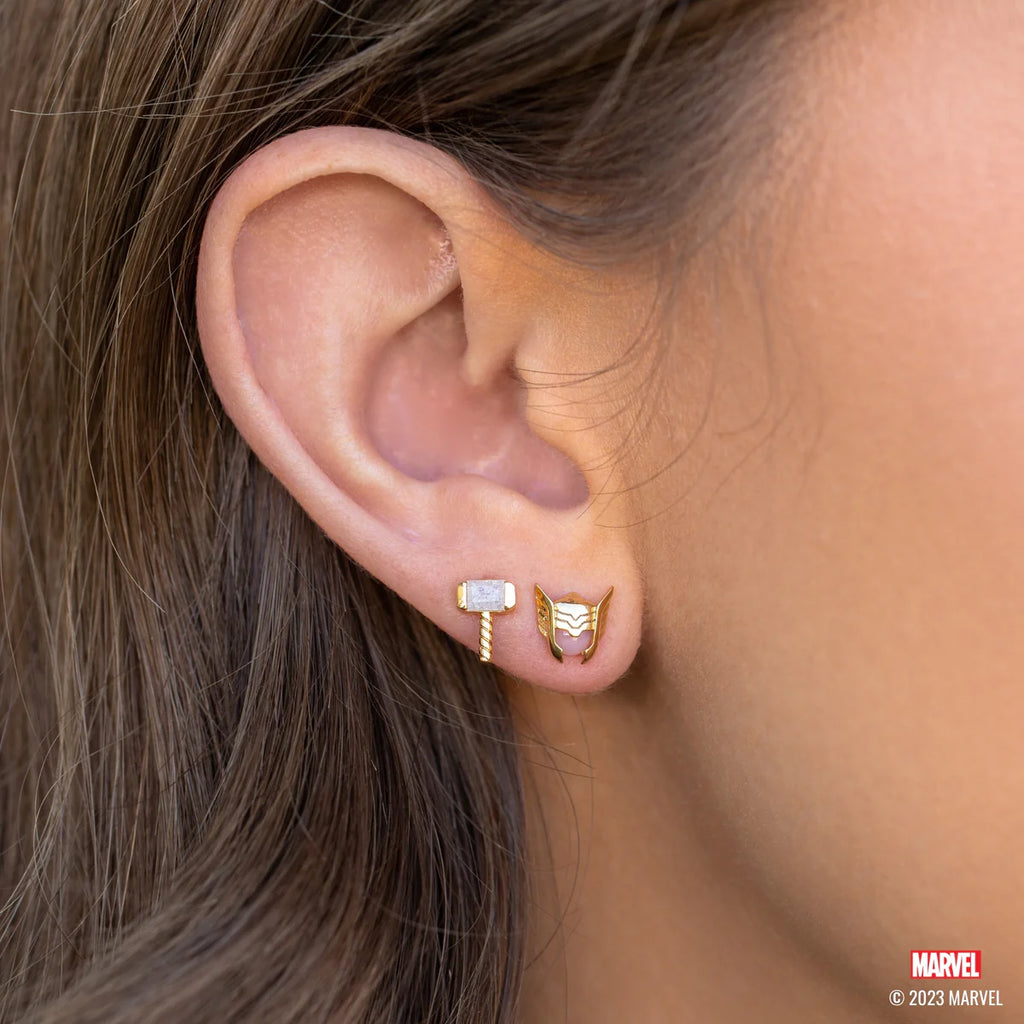Whomever wields the hammer, if they be worthy, shall possess the power of Thor! Our Marvel's Thor Studs showcase the God of Thunder and his mighty weapon, Mjölnir. The striking design features a portrait silhouette of Thor in his iconic winged helmet, holding his invincible hammer adorned with a gleaming pearlescent stone. This pairing is sure to bring the thunder to your ear stack!