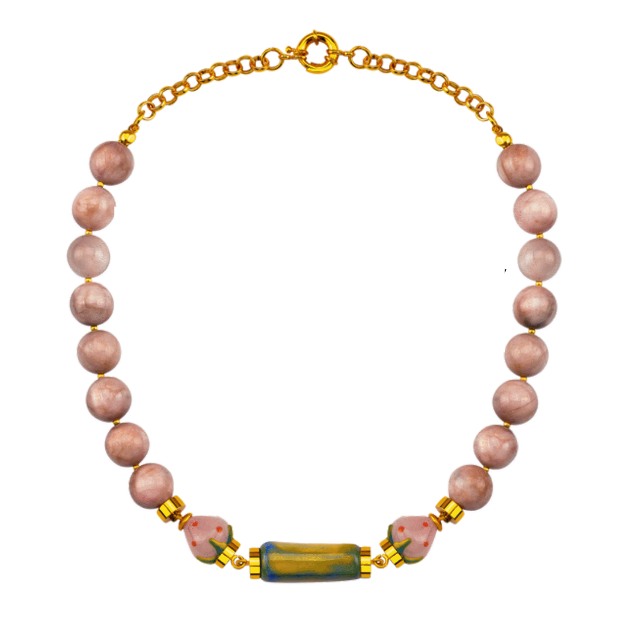 The stones are natural Kunzit, Handmade Glass Berry and Handmade Porcelain in the middle
