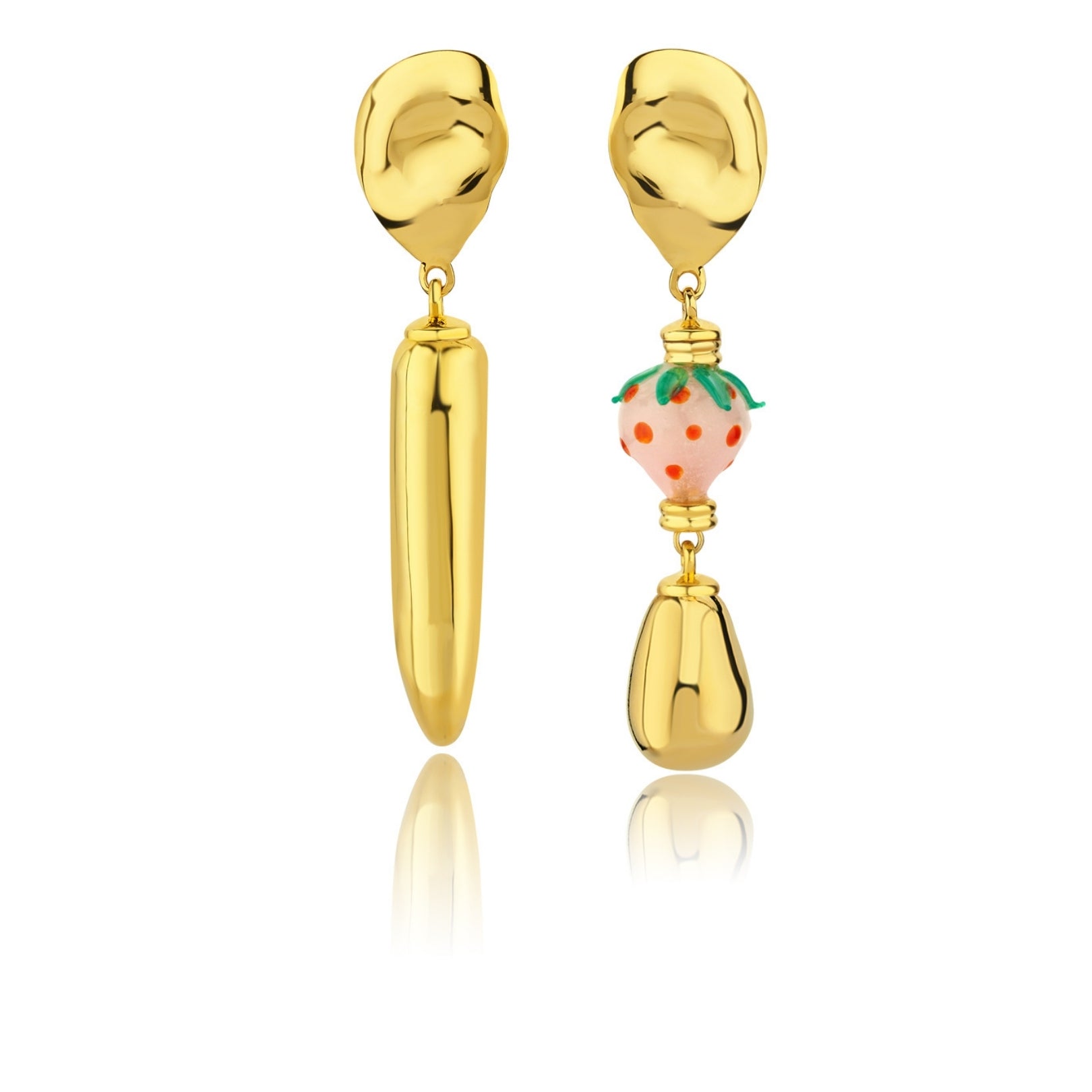 22k Gold Plated with hand made glass in a strawberry shape earring. Drop are hand shaped and gold dipped porcelain with a special technique