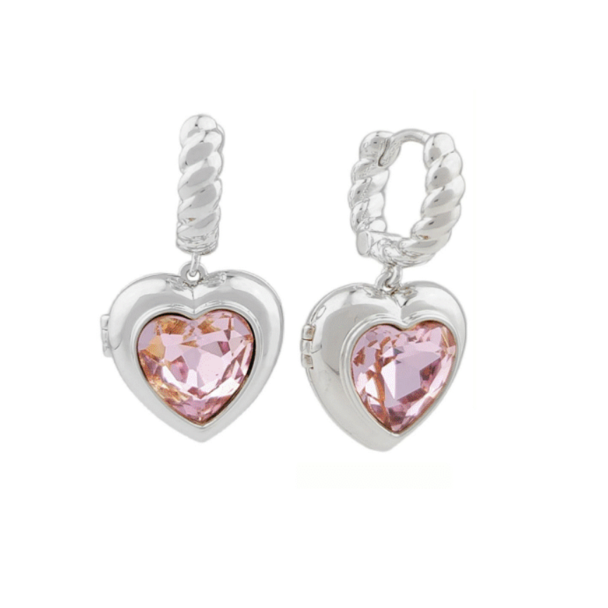 Sterling Silver Plated Stainless Steel Locket Earrings with Pink Crystal Heart Shaped Center Stone
