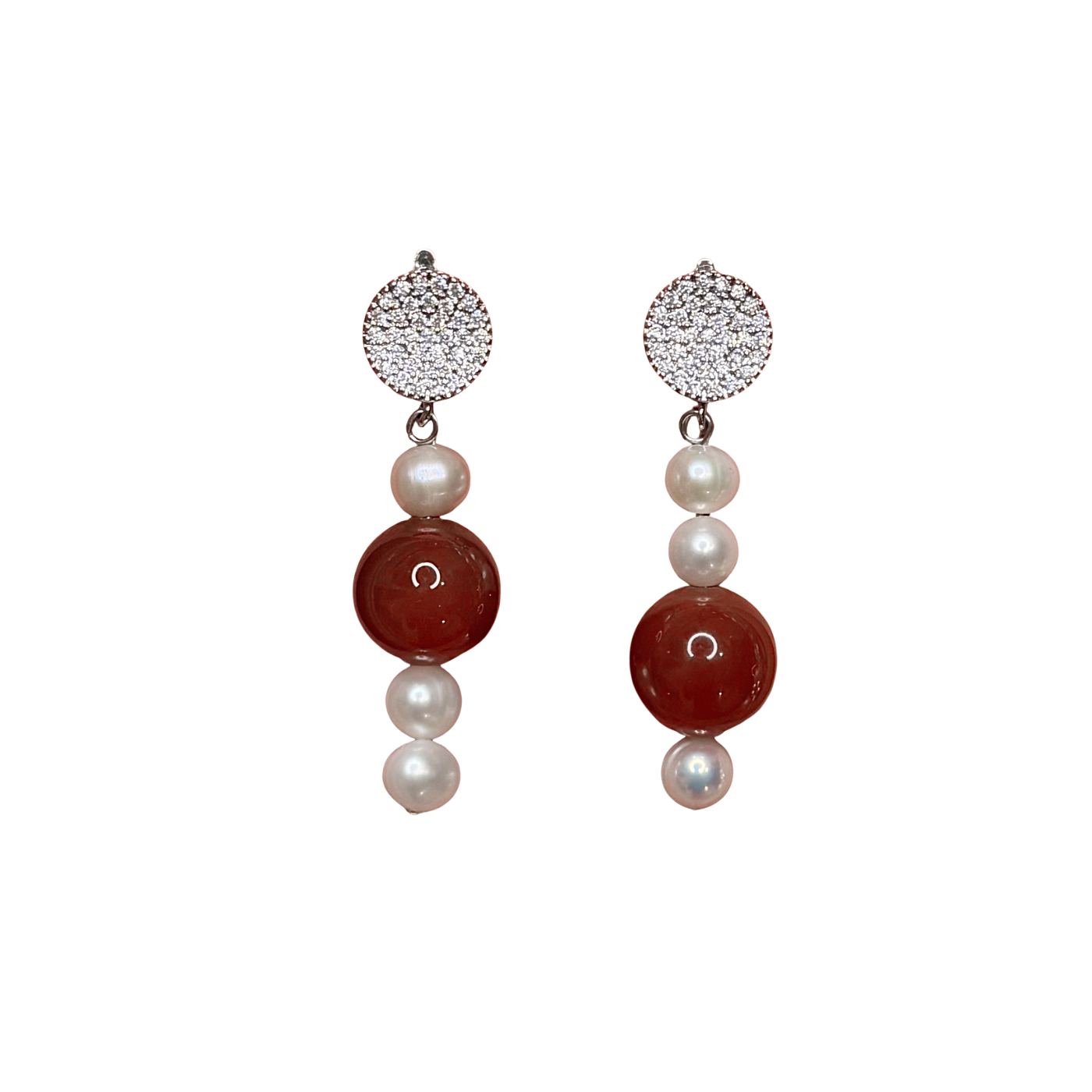 Freshwater pearls, carnelian, cubic zirconia and silver plated brass earrings.