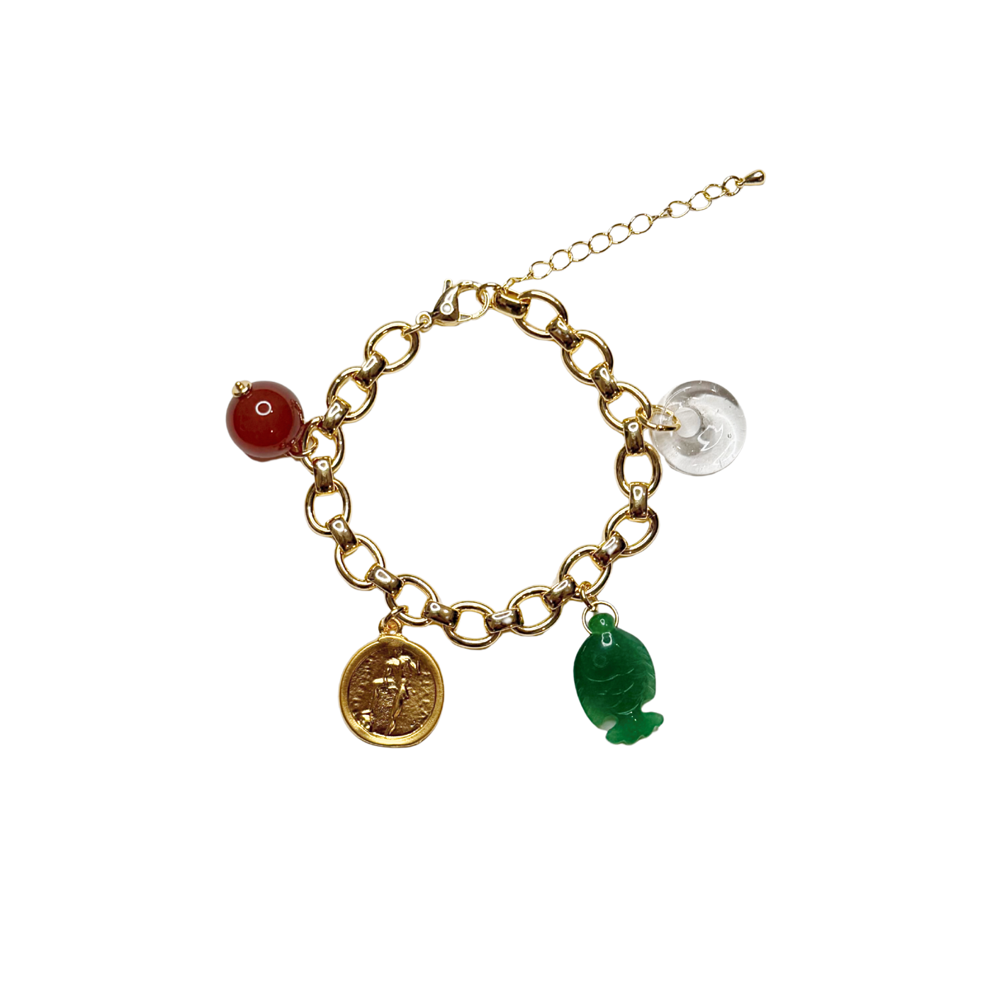 Gold plated brass, handmade glass, jade, carnelian, clear quartz and thick gold plated brass.