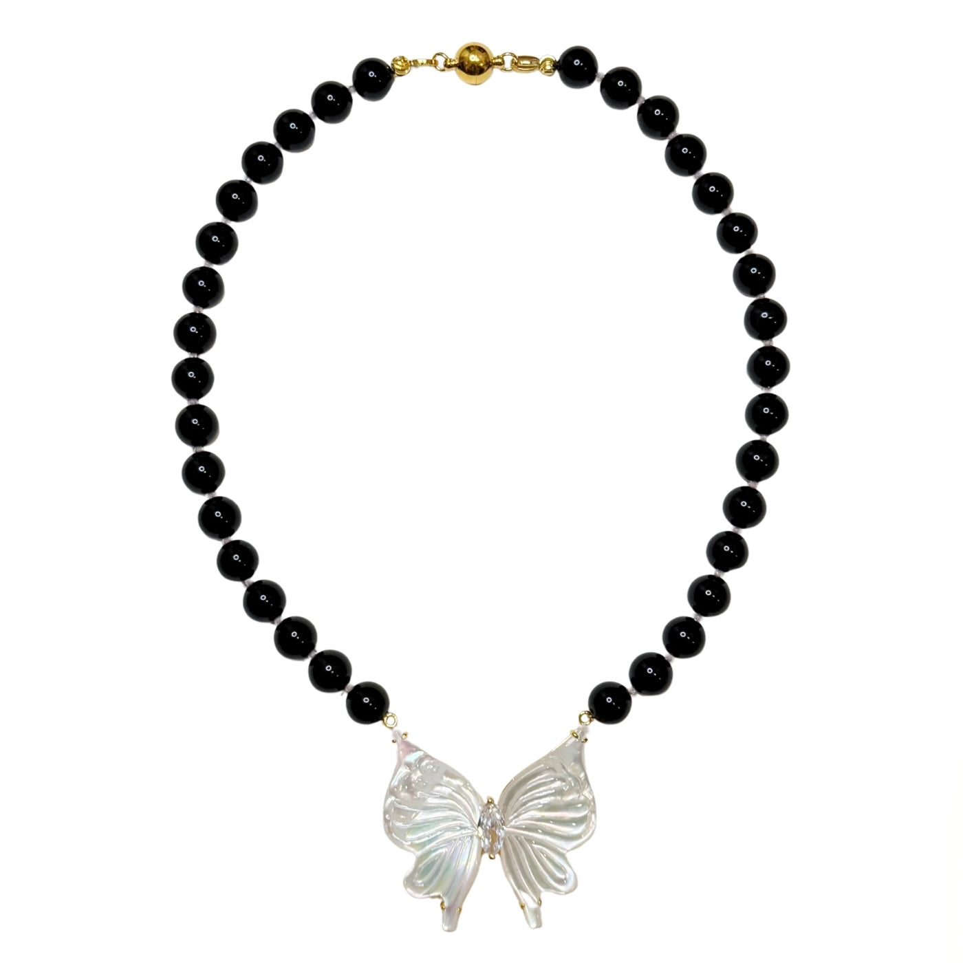 Mother of pearl, cubic zirconia, onyx and gold plated clasp.