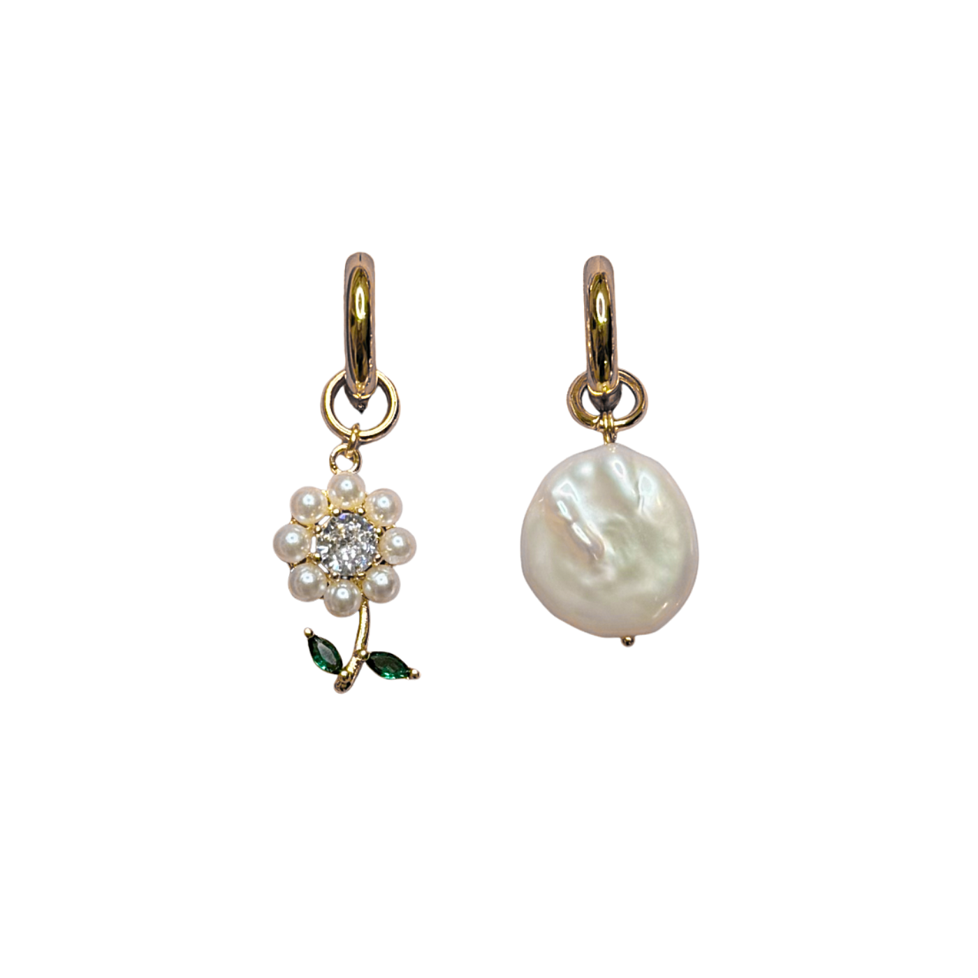 Freshwater pearls, gold plated brass, glass pearls, cubic zirconia hypoallergenic stainless steel hoops.