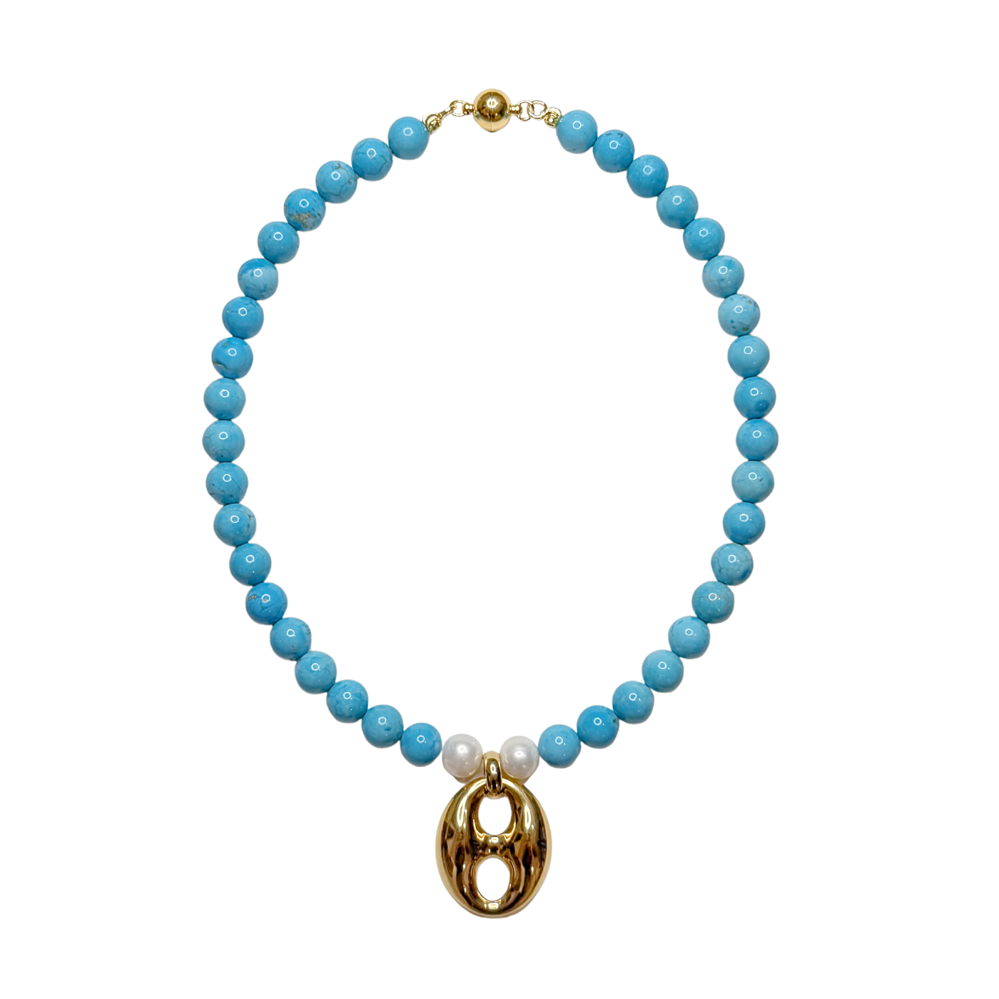 Turquoise, magnesite, freshwater pearls, gold plated brass and gold plated magnetic clasp.