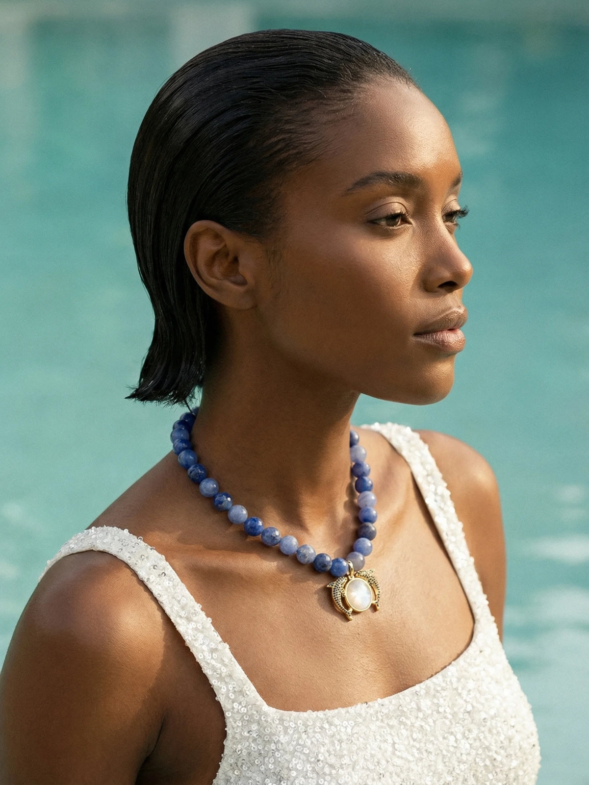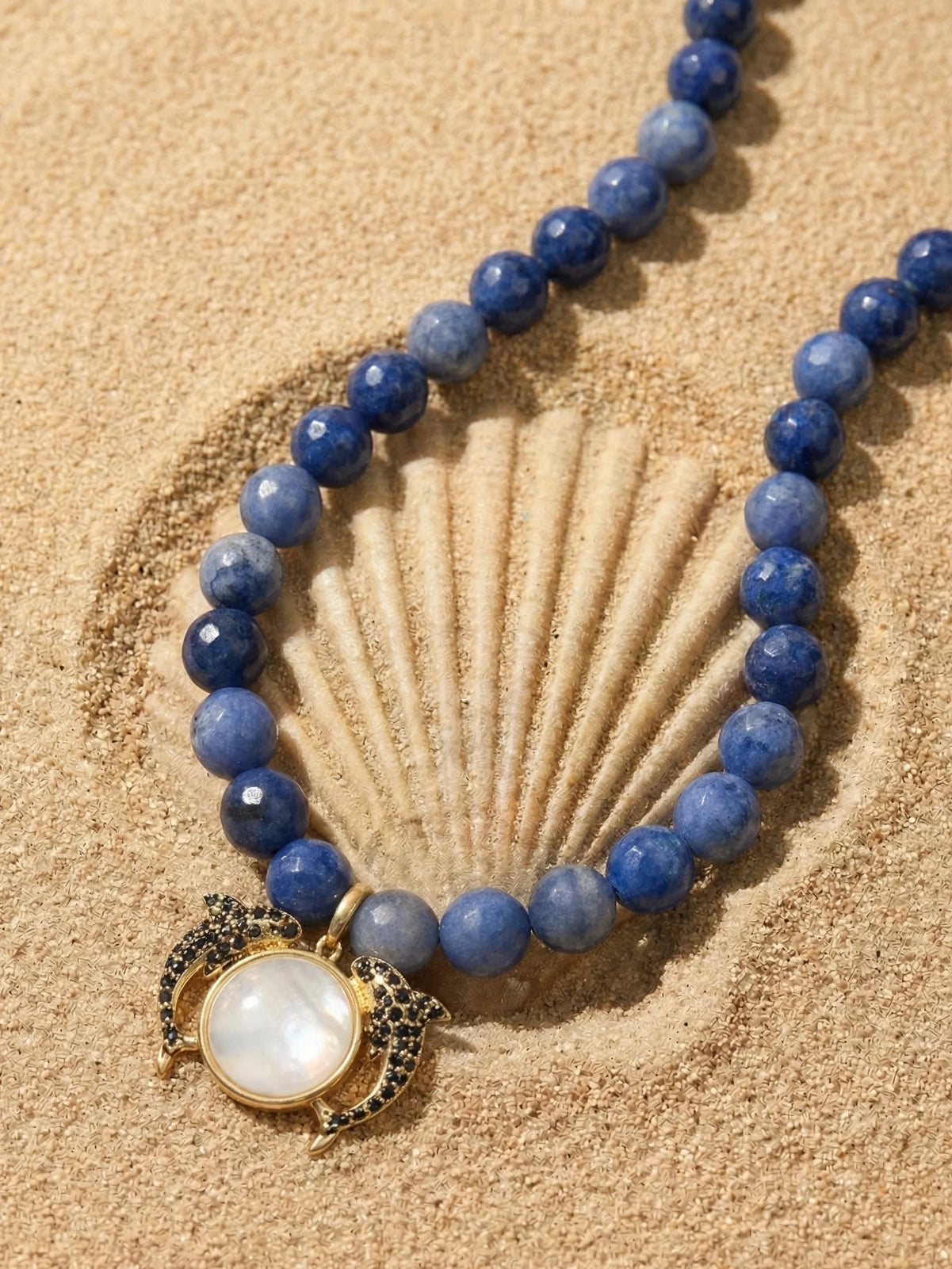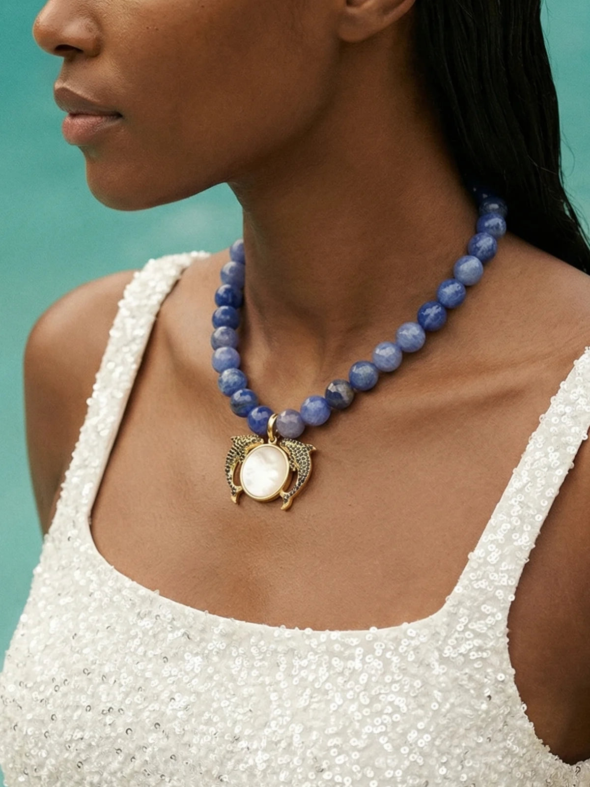 Playful dolphin and moon necklace with a delicate freshwater pearl accent — a whimsical ocean-inspired accessory perfect for holiday looks and resort jewellery collections.