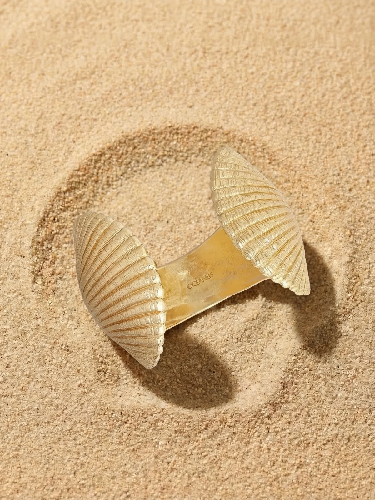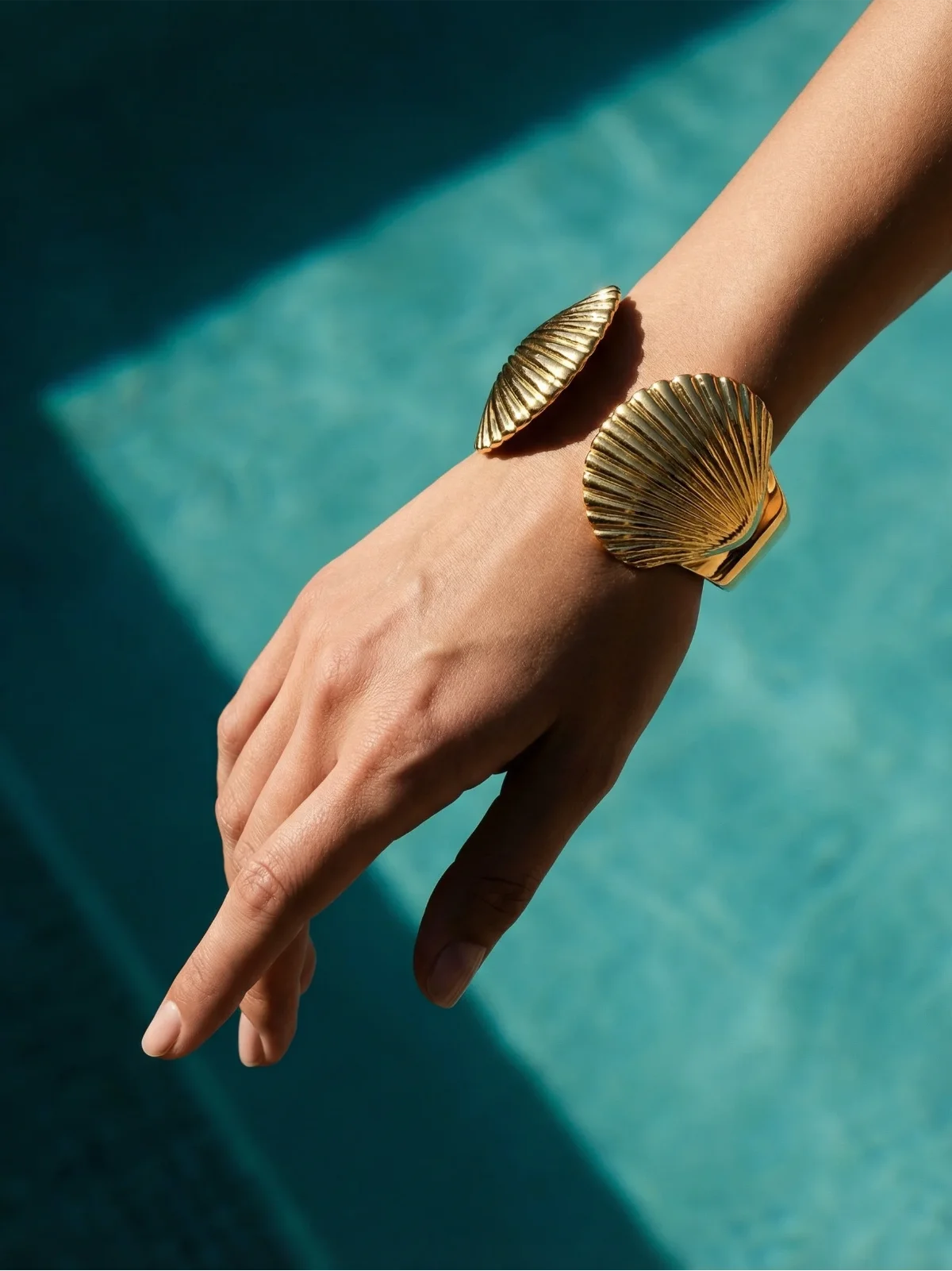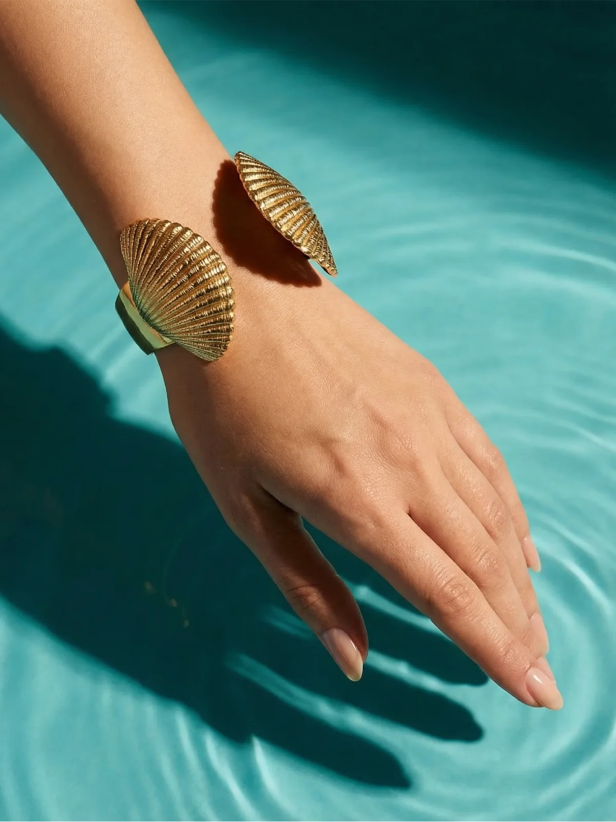 Make a bold coastal statement with the Shell Cuff Bracelet - a wide, sculptural cuff inspired by seashell textures and oceanic curves. Cast in polished gold tone brass, this cuff embodies high end beach glamour, ideal for layering with resort outfits or styled solo as a statement piece.