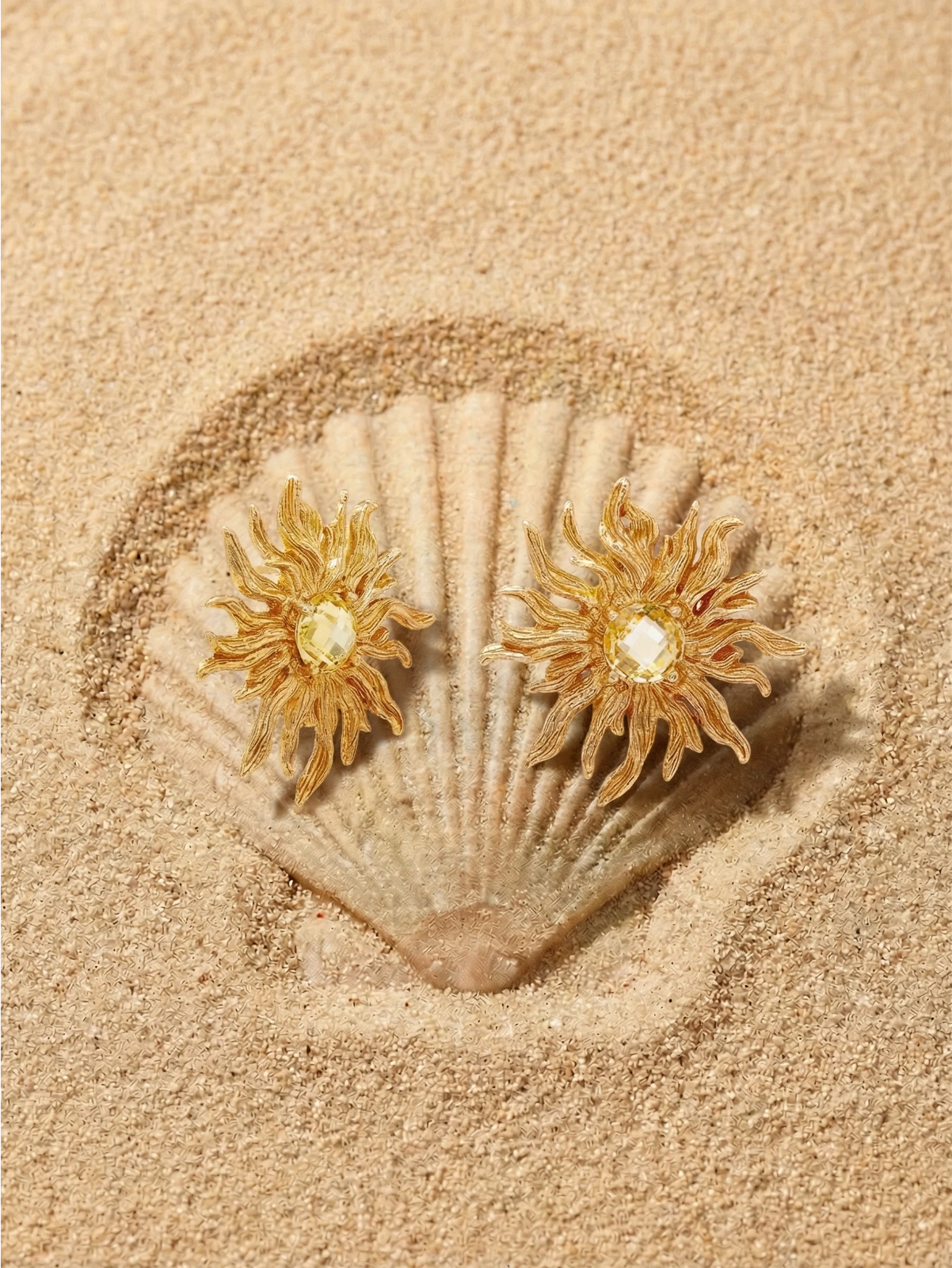 Bold gold sunburst earrings with a brilliant central crystal, designed to capture sun-drenched glamour. Perfect for summer events, cocktail looks or adding a touch of coastal luxe to everyday style.