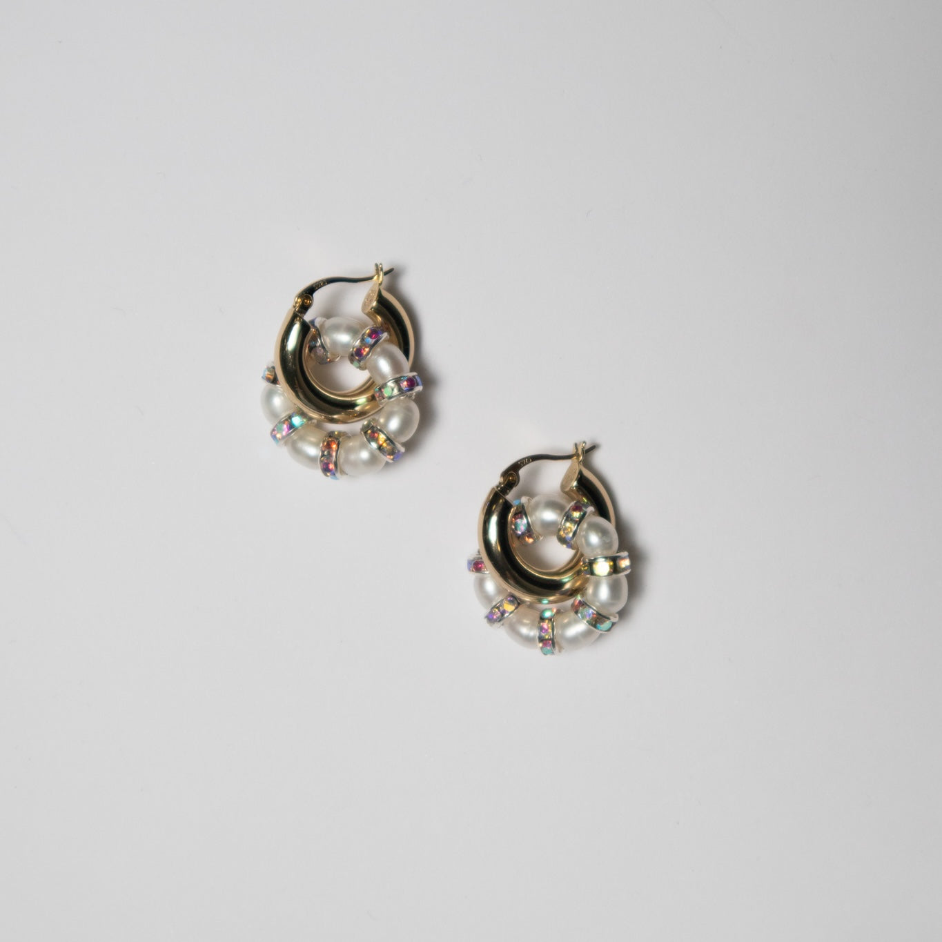 Gold plated brass hoops, 925 sterling silver ear stick, gold plated brass rondelle beads and glass crystals.