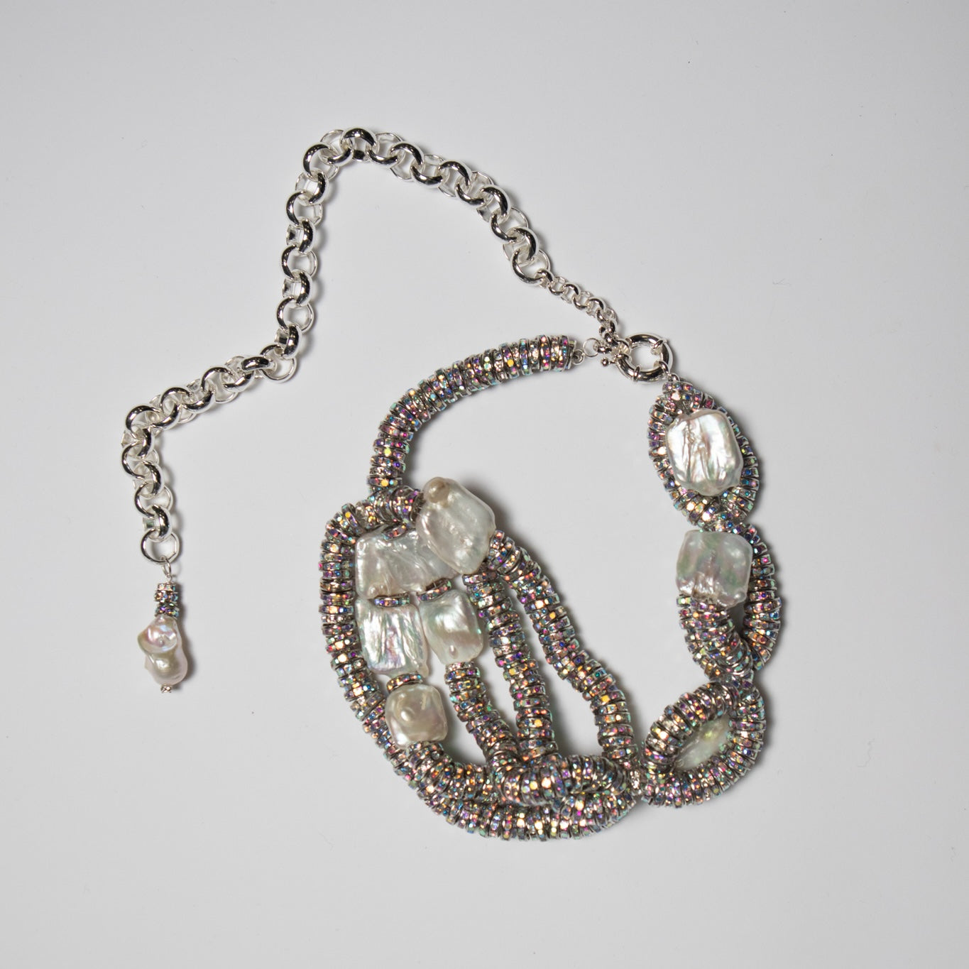 Silver plated brass rondelle beads, glass crystals, baroque freshwater pearl, silver plated copper spring ring.