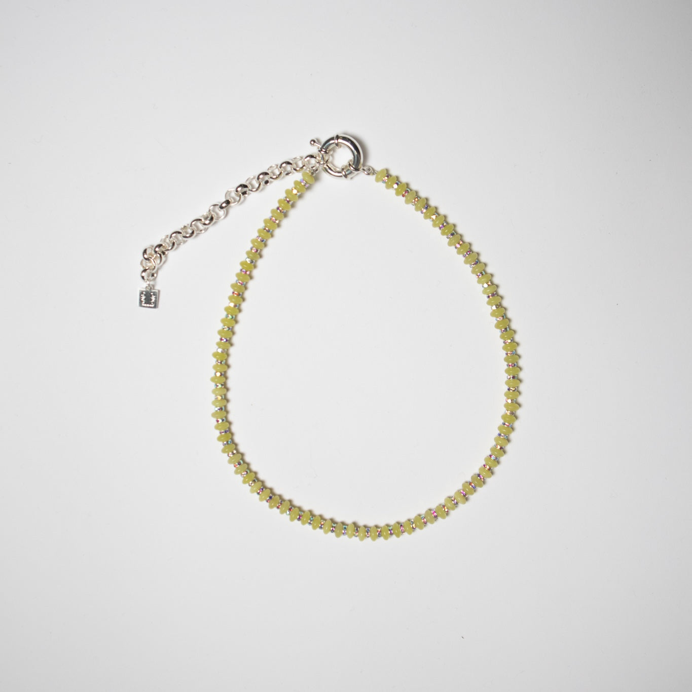 Natural stone beads, silver plated brass rondelle beads, glass crystals and silver plated copper spring ring.