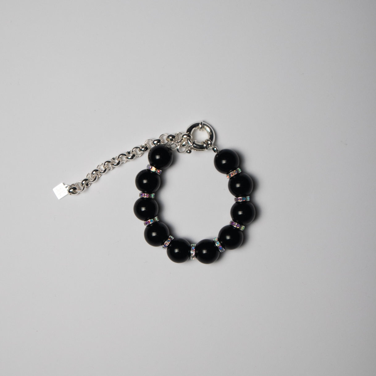 Natural stone beads, silver plated brass rondelle beads, glass crystals and silver plated copper spring ring.