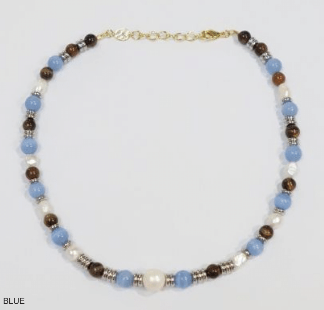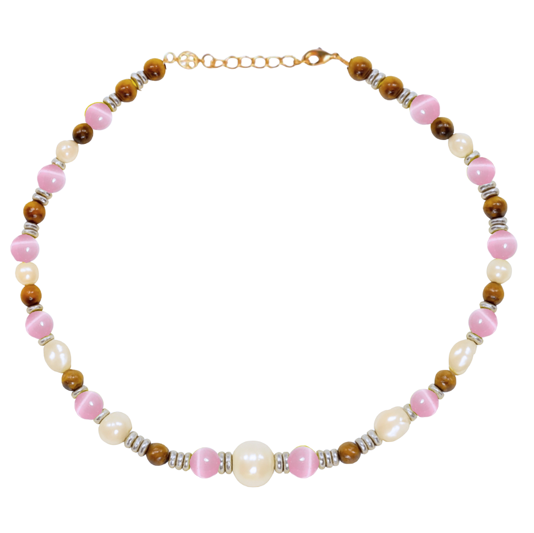 Glass beads, potato pearls, stainless steel beads and an 18k gold plated extension chain.