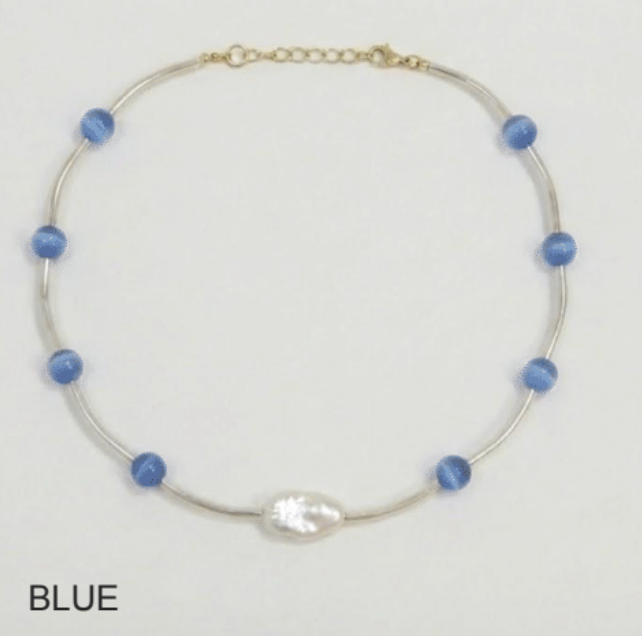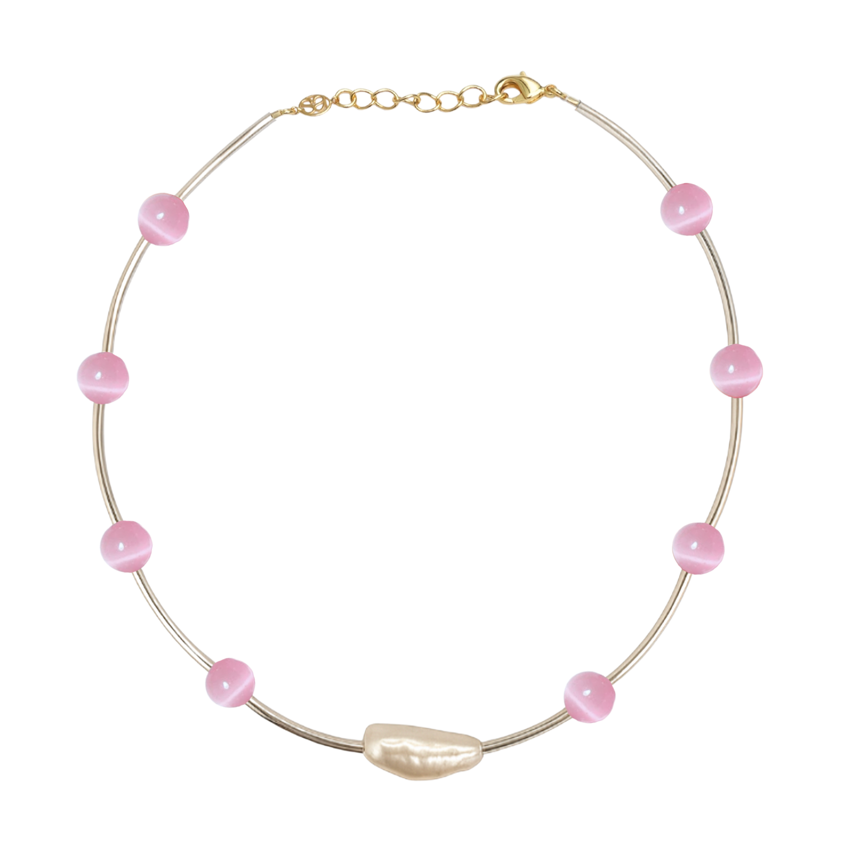 Stainless steel tubes, glass beads and keshi pearls with an 18k gold plated extension chain.