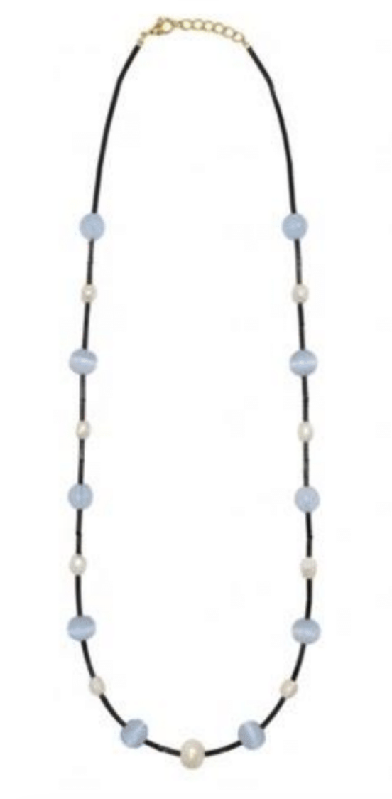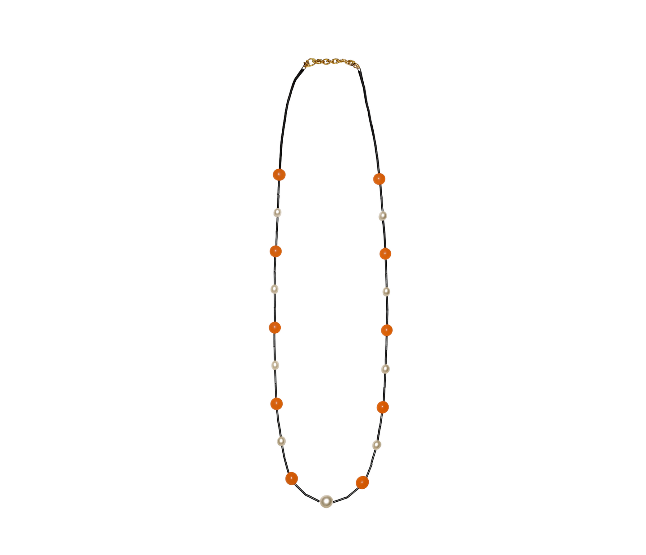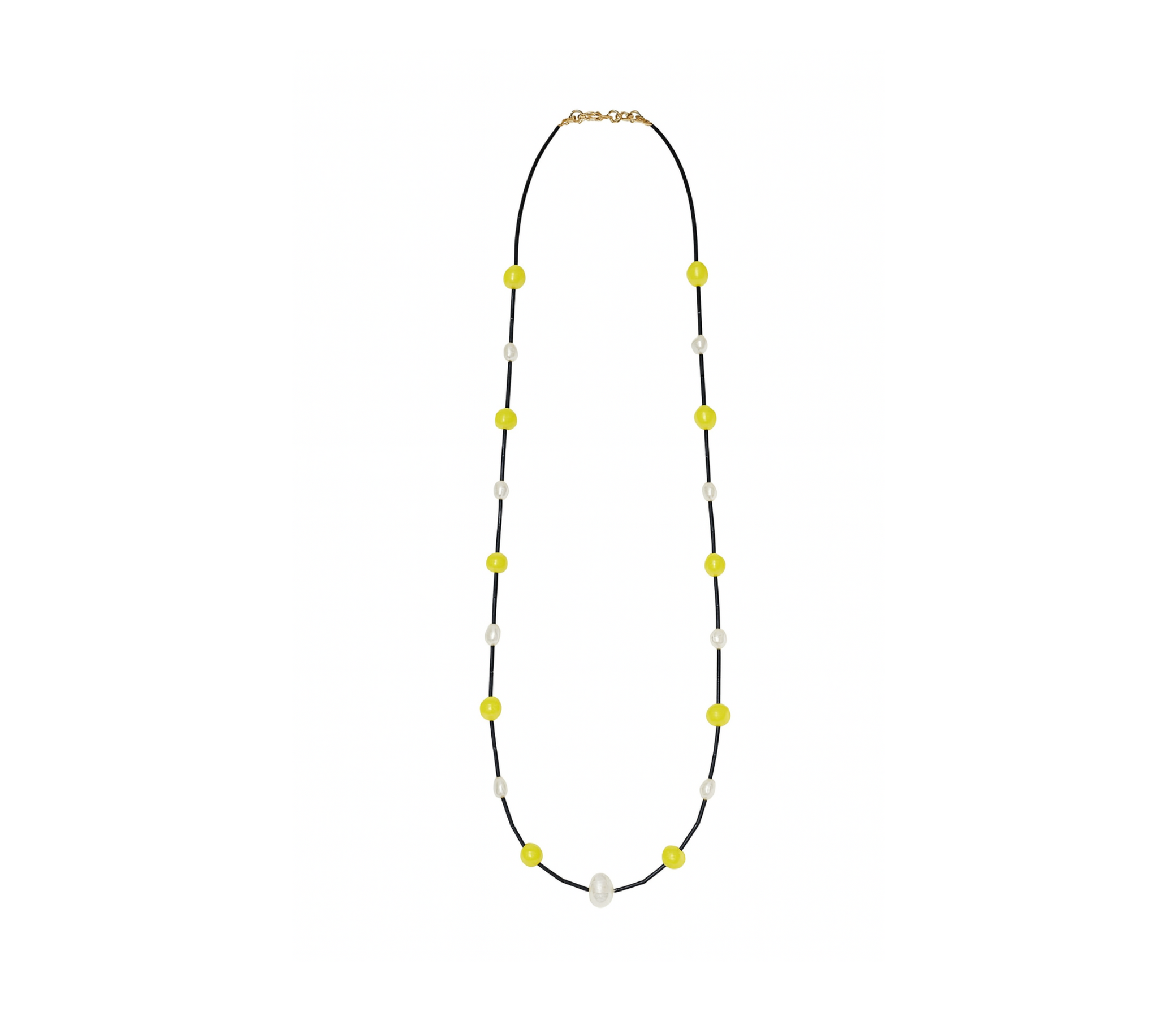 Black glass tubes, glass beads, potato pearls and an 18k gold plated extension chain.
