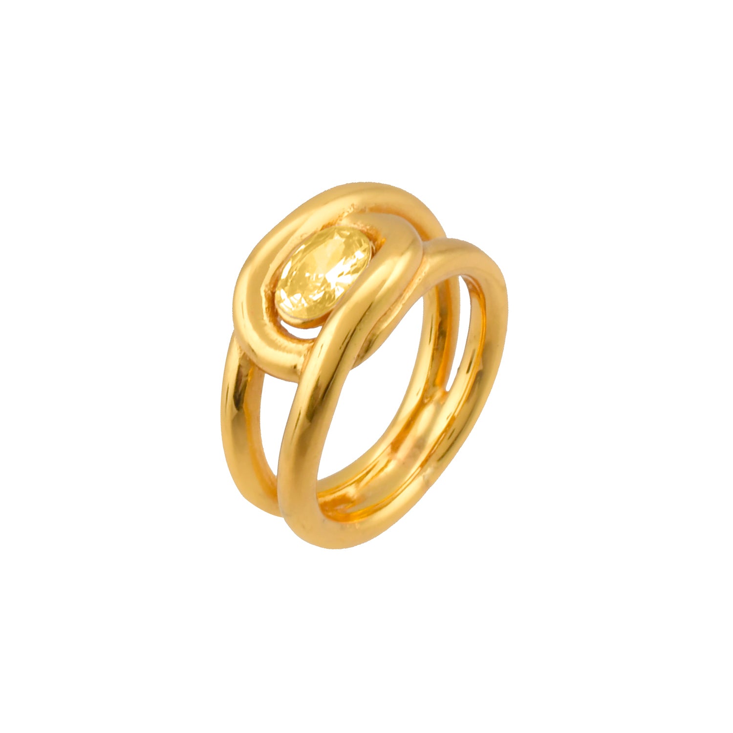 The Anya ring is our latest extra chunky ring. Formed of a rounded thick intertwined gold band with a small crystal in the centre. The Anya ring is the ultimate everyday statement ring. Feminine and minimal white still being bold.
